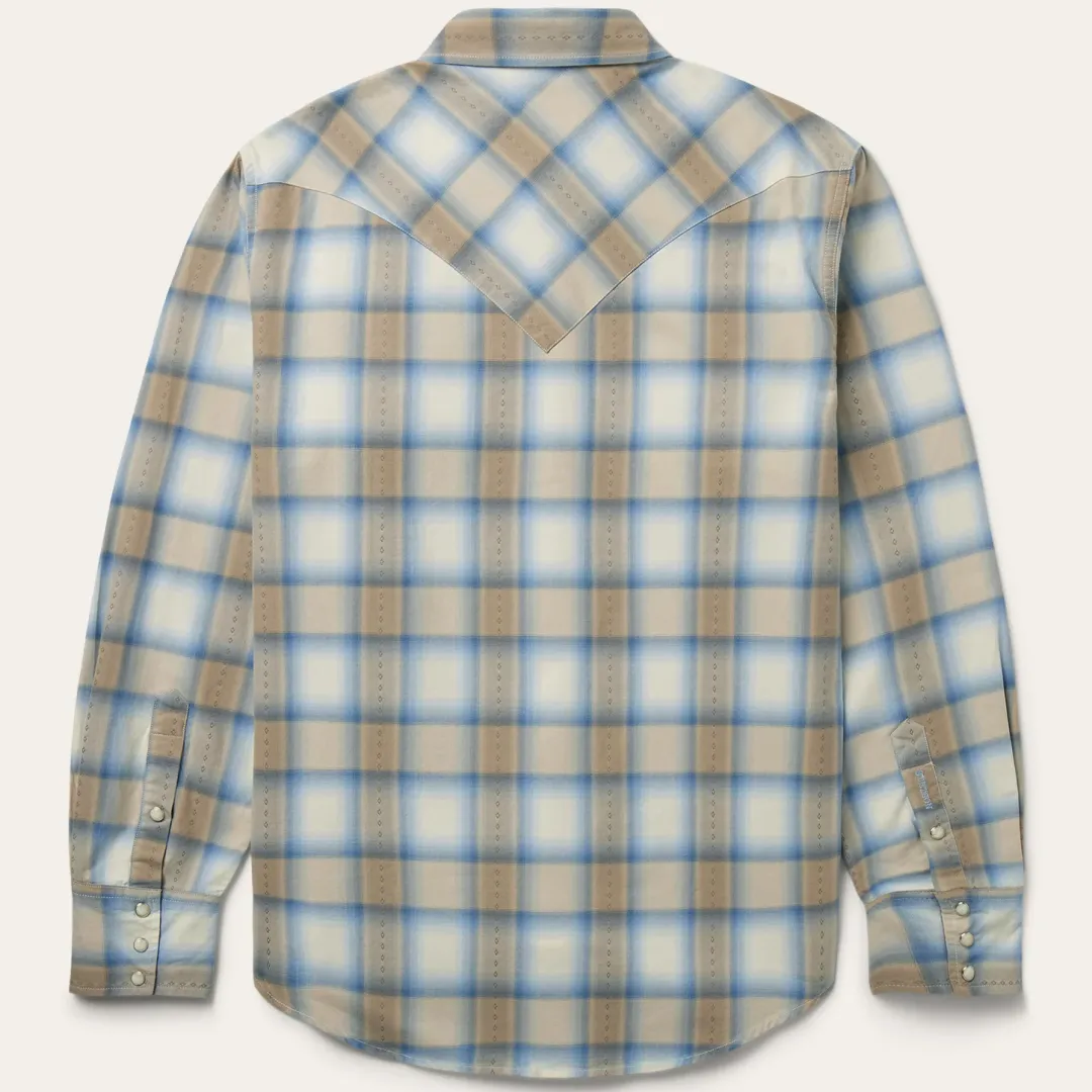 This western shirt is crafted from yarn dyed 100% cotton dobby and features an exclusive sand plaid with satin stitch. It has a one-point ultra-deep curved back yoke, logo pearl snap front, contrasting chambray inside trim, and three snap cuffs. The front left pocket is embroidered with the Stetson “S” logo and the right sleeve placket is embroidered with “STETSON.” Garment washed for softness, it has the feel of an old favorite that will only get better with time. Cut trim for a modern fit.