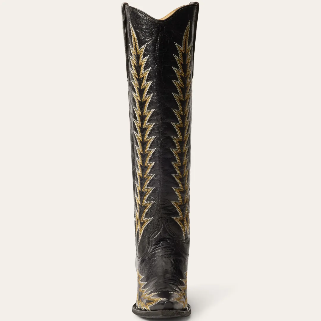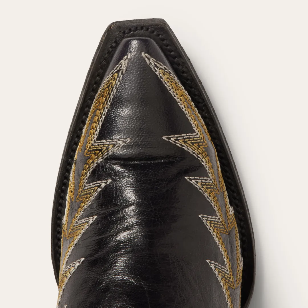 The statement-making Sarah Boots have a Goat Leather Vamp and 18” Shaft and a unique vintage flame embroidery. Additional details include a stacked heel, premium leather lining, premium brass nails and hand-driven lemonwood pegs that enable the boot to withstand the elements by expanding and contracting with any moisture the boot may encounter.Our western boots are handcrafted with the same care and consideration that goes into our legendary headwear, resulting in the ultimate mix of heel-to-toe comfort, durability, and classic Western style. Their rugged construction is fit for a lifetime of adventure, with high-quality leathers that will develop an attractive patina over time and conform to the wearer, providing years of reliable service.