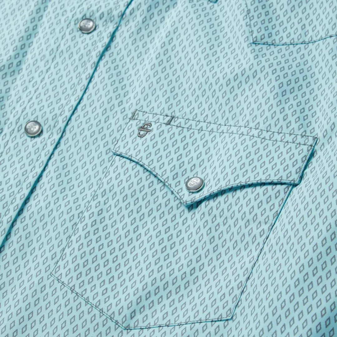 This Western-style shirt is crafted from crisp, lightweight 100% cotton poplin printed with an eye-catching allover Silver Diamond Neat pattern. It features a one point ultra deep curved back yoke, the Stetson “S” embossed on the front left pocket, and “STETSON” embossed on the right sleeve placket. The classic snap front features logo snaps, while the solid poplin inside trim provides a subtle contrast.