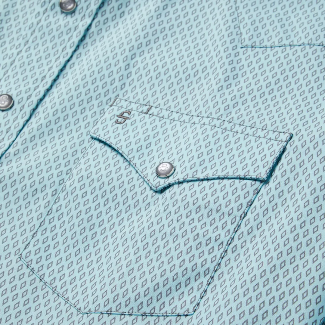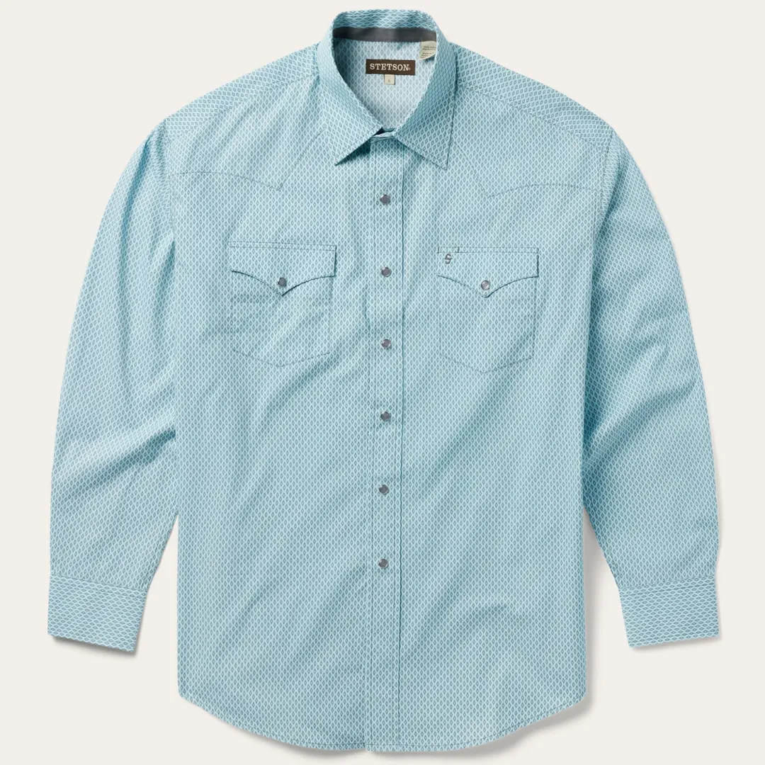 This Western shirt is crafted from a lightweight cotton poplin with a Silver Diamond Neat allover print. It features a one-point curved back yoke, logo snap front, and three snap cuffs. The front left pocket is adorned with the Stetson “S” logo and the right sleeve placket is embossed with “STETSON”. It has a solid poplin inside trim and is crafted with 100% cotton for quality, breathability and a soft feel that will only get better with age.