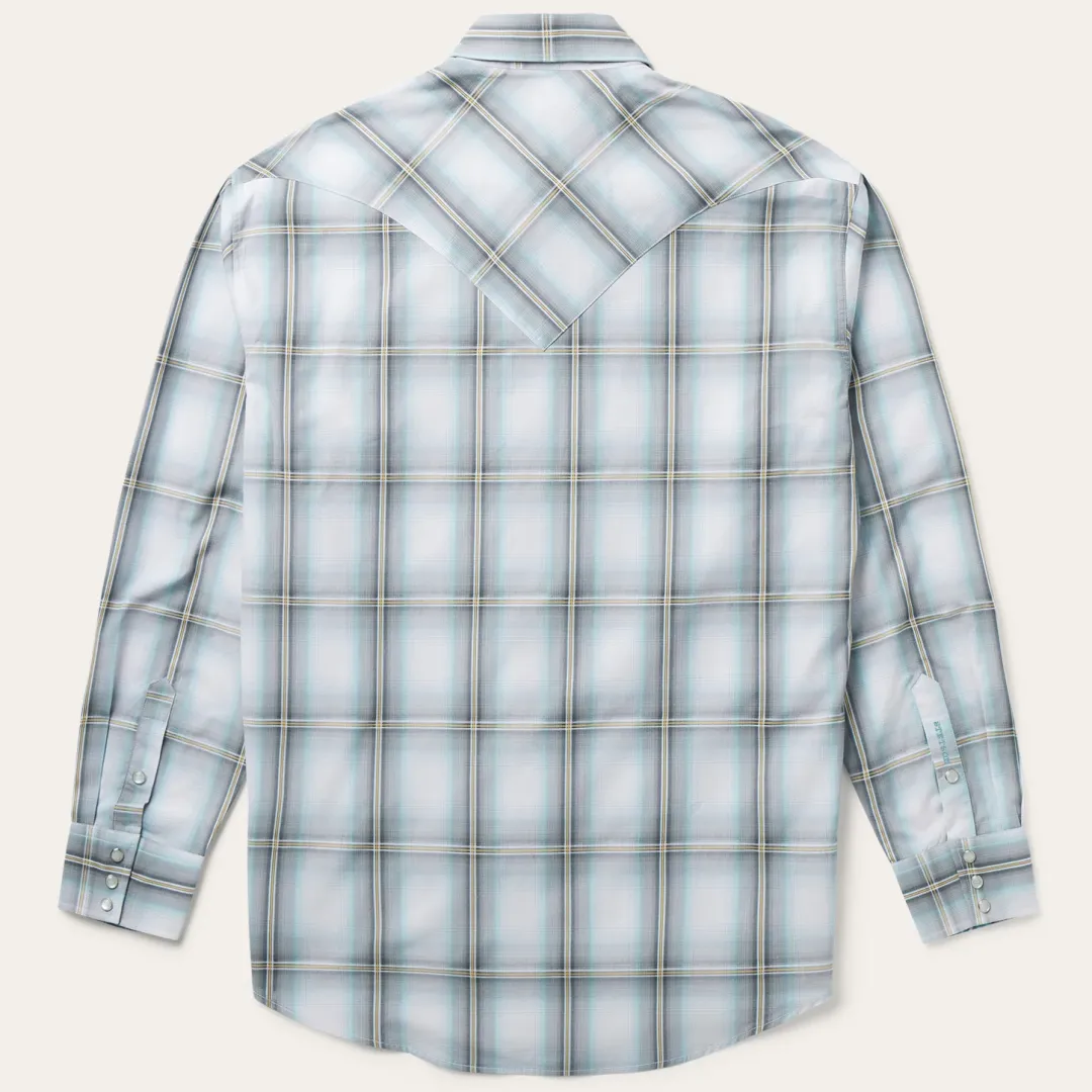 This Western shirt is crafted from a yarn dyed Gray Sky Hombre plaid with satin stitch. It features a one-point ultra-deep curved back yoke, logo snap front, and three snap cuffs. The front left pocket is embossed with the Stetson “S” logo and “STETSON” is embossed on the right sleeve placket. It has a contrast inside trim and is made with 100% cotton for quality, breathability and comfort.