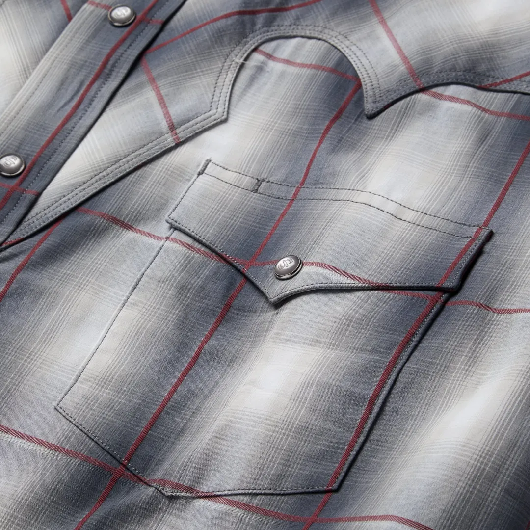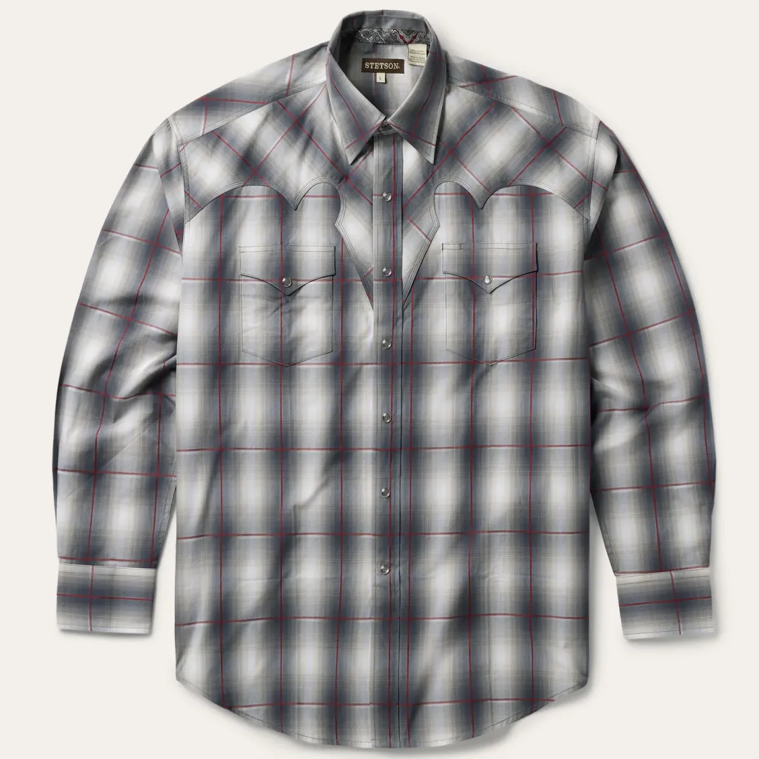 This Western shirt is crafted from a yarn dyed Smoke Ombre plaid with satin stripe. It features fancy front and back yokes with triple needle stitching, a Stetson “S” logo embossed on the front left pocket, and “STETSON” embossed on the right sleeve placket. It has a contrast inside trim, 3 snap cuff, and classic snap front featuring logo pearl snaps. Made from 100% cotton for quality and breathability, it has a feel that will only get better with age.