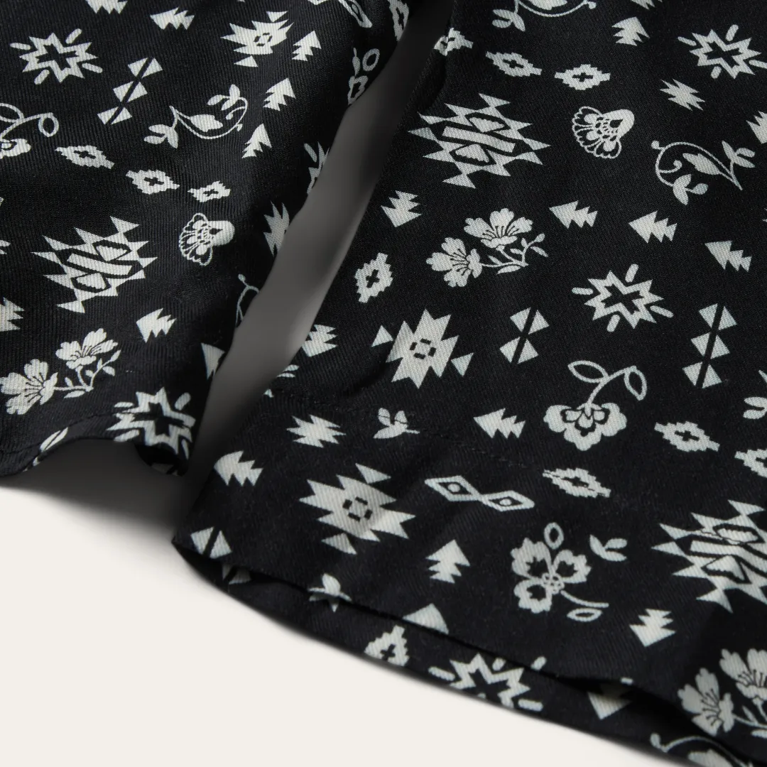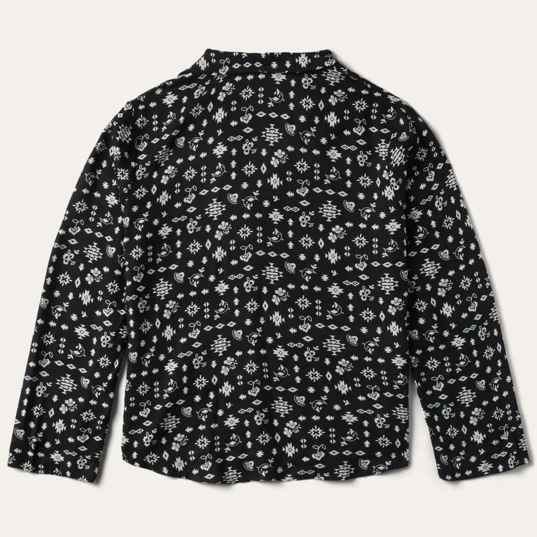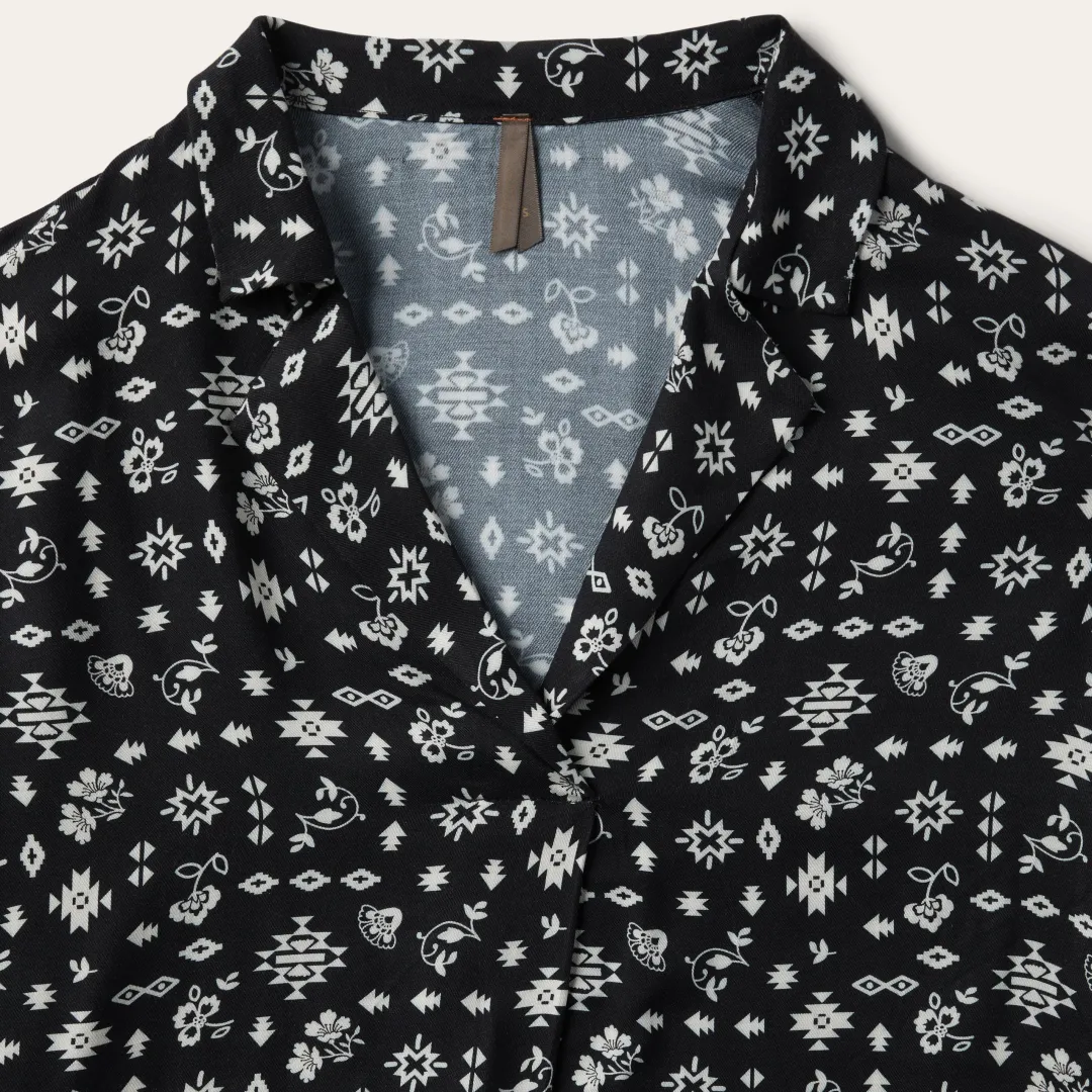 This pullover blouse is crafted from 100% rayon twill and features an allover Southwestern Ditzy print. It has an open notch collar with a V-neckline, long sleeves with a slight bell and a large pleat at the center front.