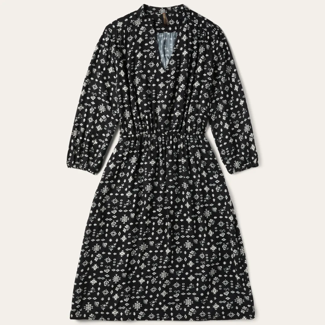This eye-catching, mid-length, zippered dress is woven from 100% rayon twill and features an allover Southwestern Ditzy print. It has a stand collar with a V-neckline, a straight back yoke with gathers below the elastic waist, long sleeves with elastic cuffs and side seam pockets.