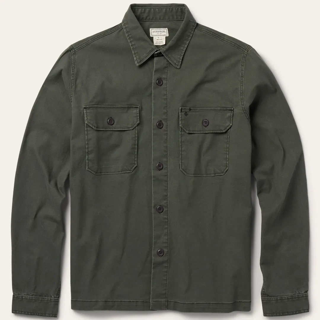 This snap front western shirt is crafted from 100% cotton and features a yarn-dyed rustic plaid with satin stitch. Two snap-closure pockets, a spread collar, contrast inside trim Rugged and stylish, this canvas shirt jacket is crafted from a durable cotton canvas with just a hint of stretch. It has a spread collar and a straight back yoke, while its front features large rectangular mitered chest pockets and flaps and button closure, straight hem and a one-button cuff. At Stetson, we use the toughest materials and fabric to provide you with the best Western outerwear for men who spend their days in the great outdoors.