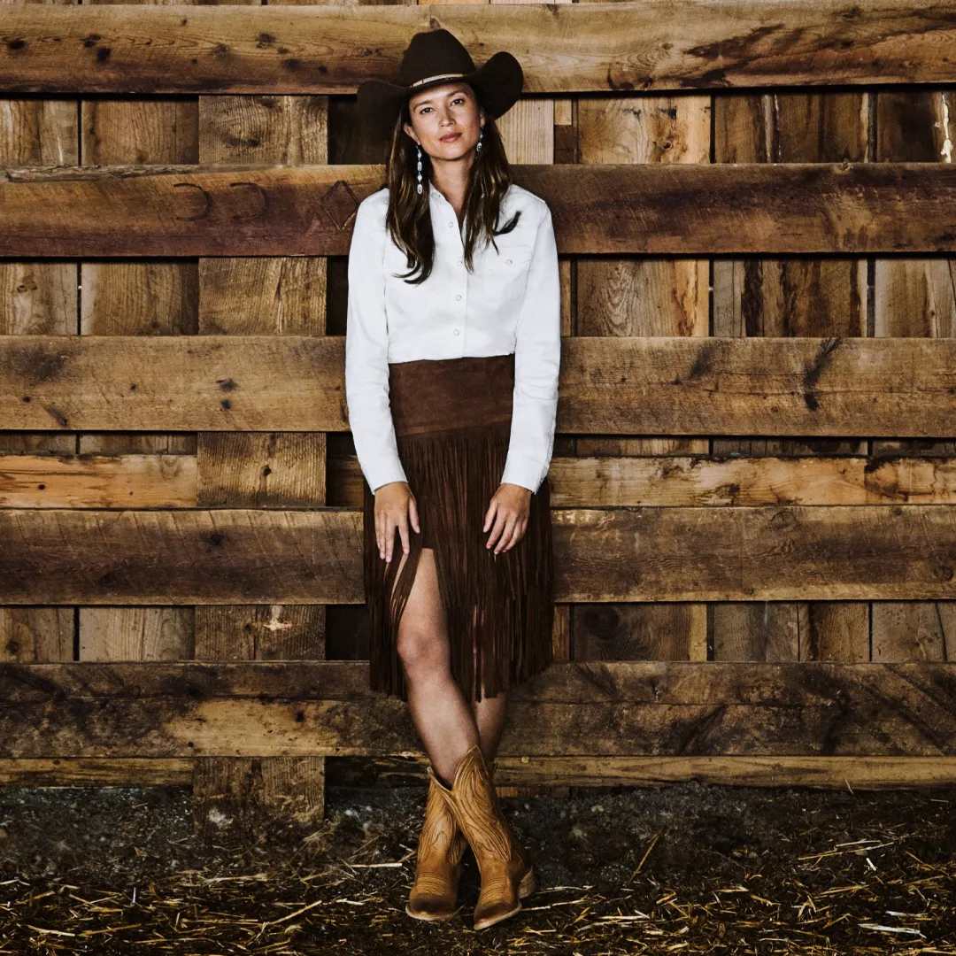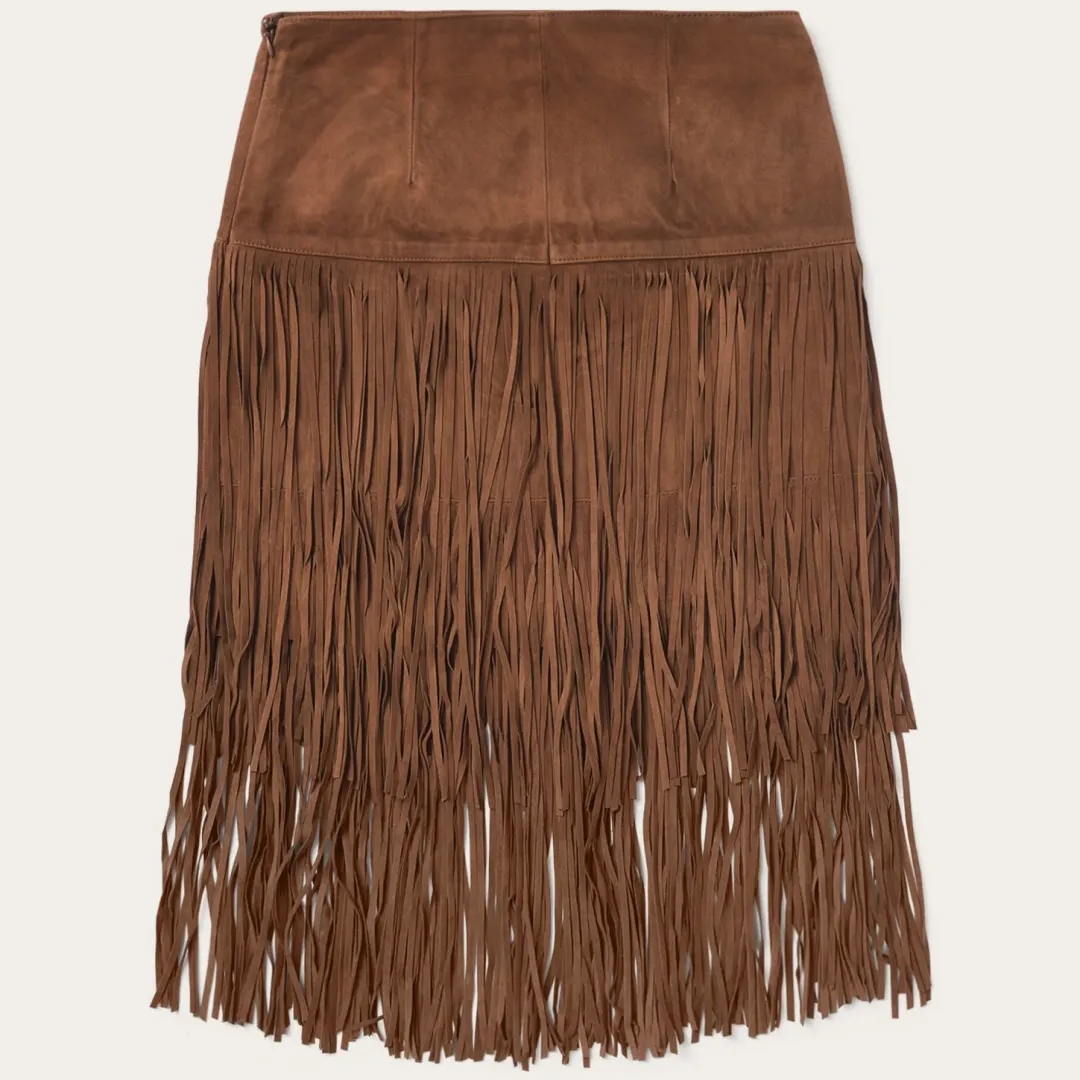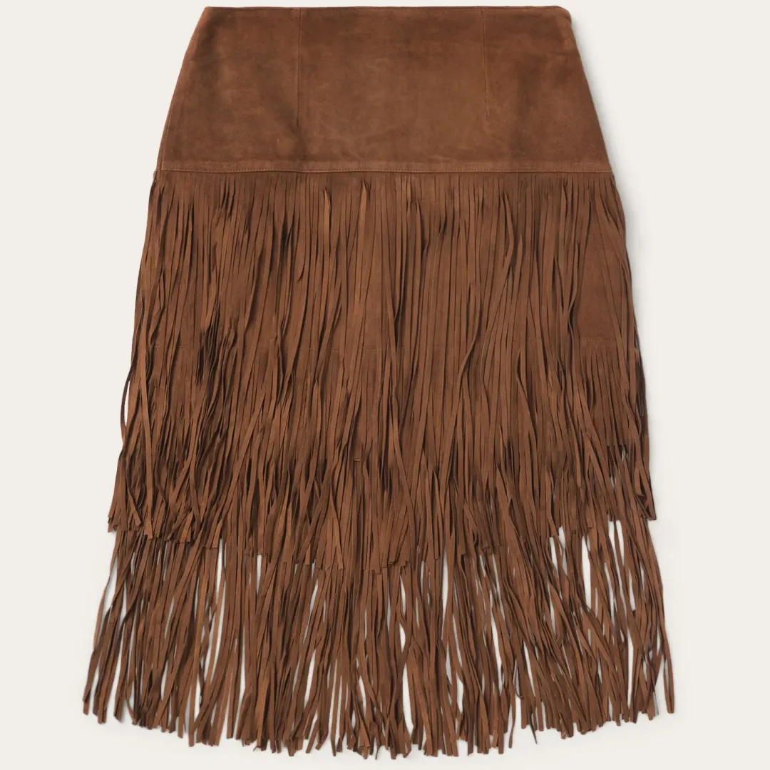 Yee haw! This lamb fringe suede skirt doesn’t skimp on the Western style. With two tiers of fringe and an invisible side seam zipper, this fully-lined longer length skirt is bound to make a statement.