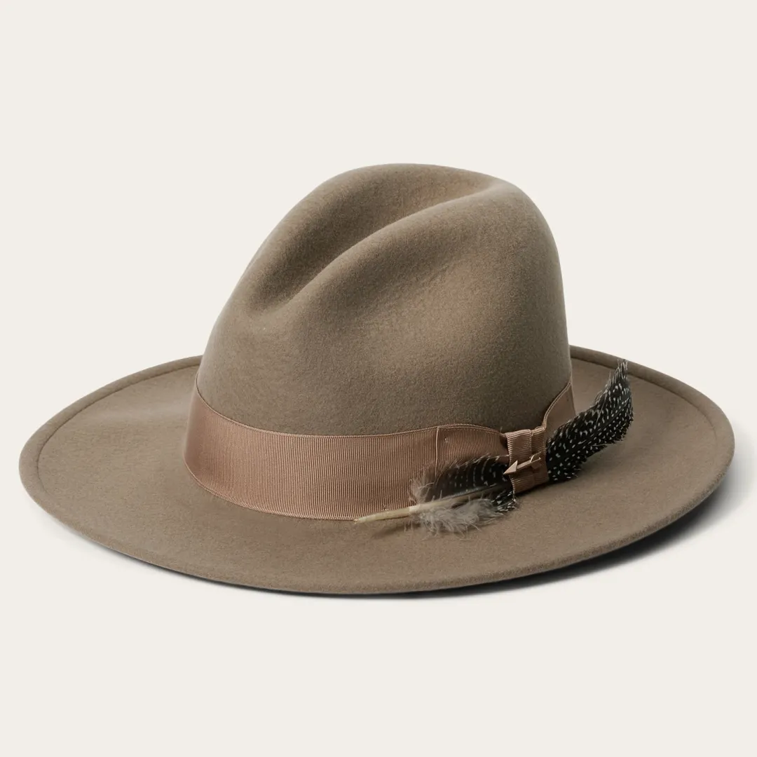 This striking, stylish fedora is made in the USA of 100% firm wool felt. It features a 4 1/2” teardrop crown and a 4” bound-edge flat brim. Additional details include a five-chain link hat band, a silver-toned arrow pin and a cloth sweatband for breathability and comfort.