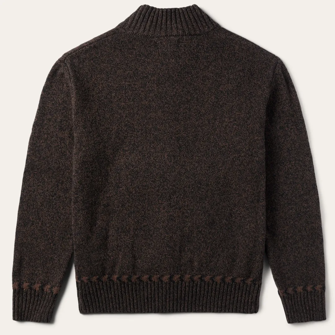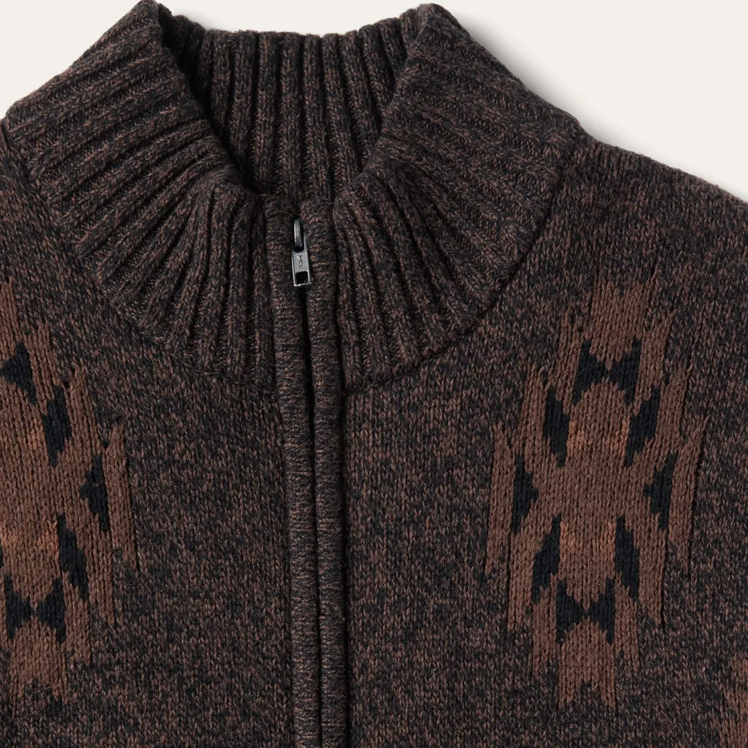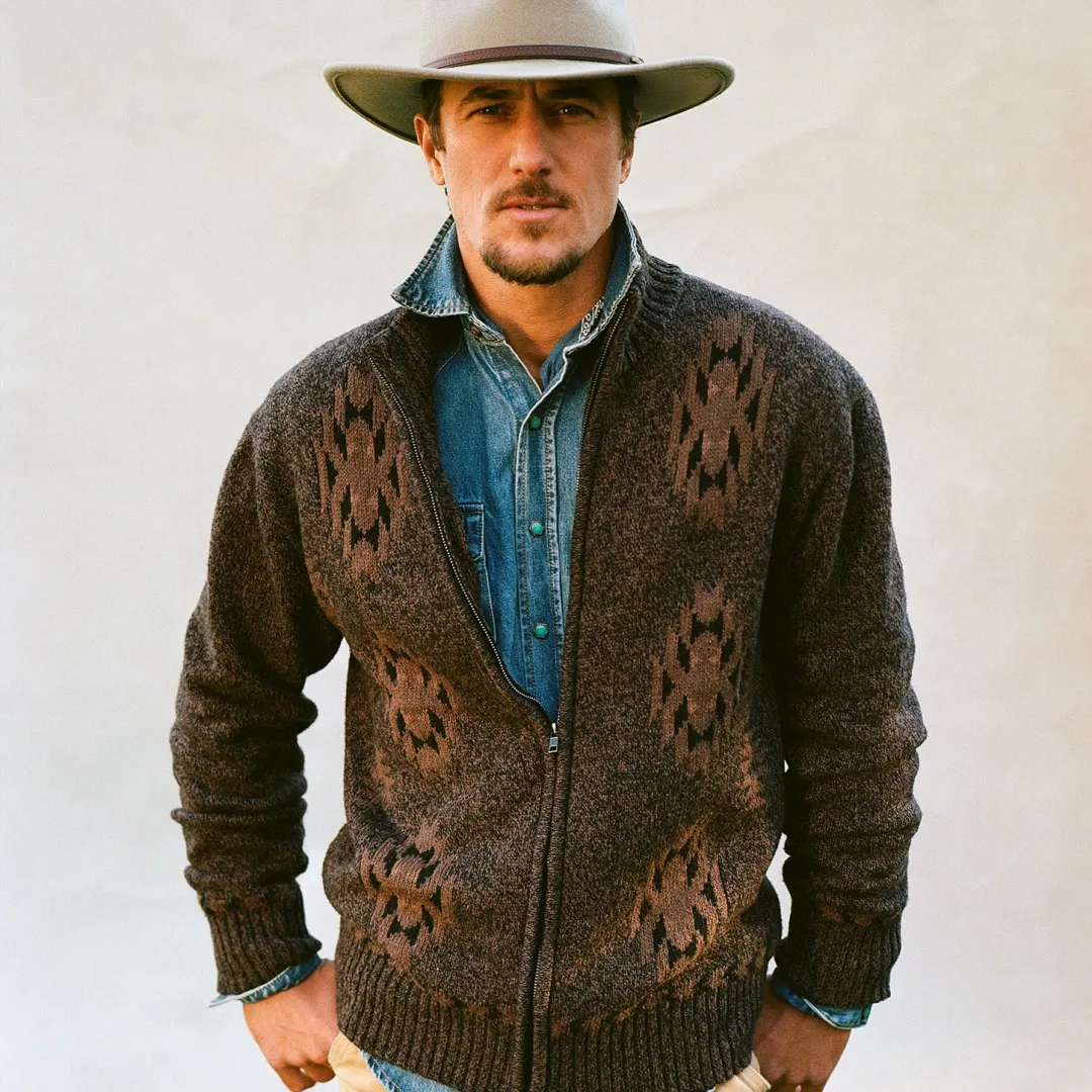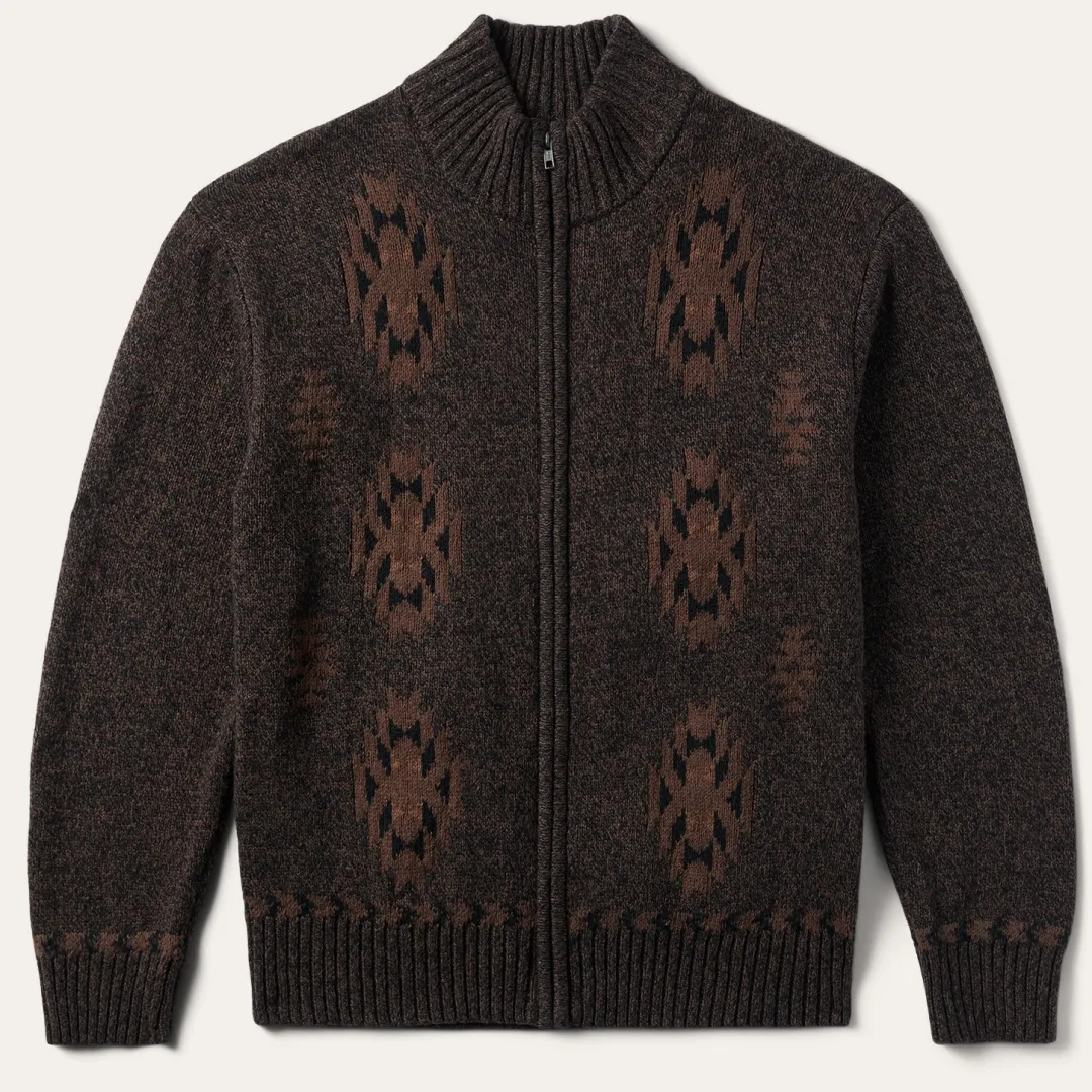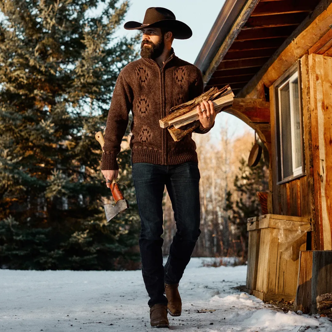 This rich chocolate zip-front cardigan features an exclusive vertical Aztec-inspired design on its front. It has two side pockets and a self-knitted collar, cuffs and waistband. Made from a wool blend, it provides warmth, comfort, and a dose of rugged style.