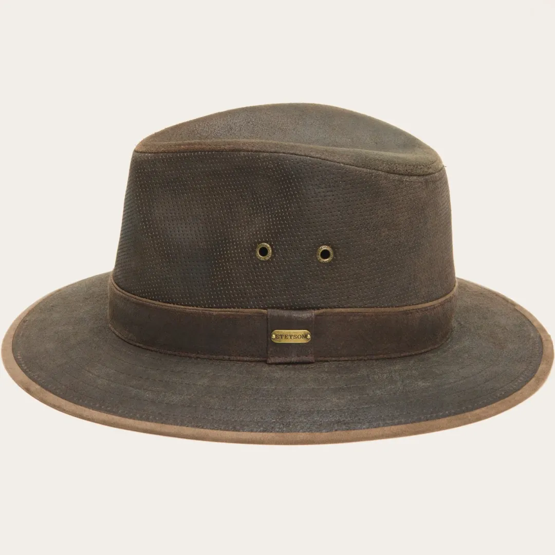 The Weathered Leather Safari hat features a 2 3/8 brim with bound edge, leather trim and side ventilation.