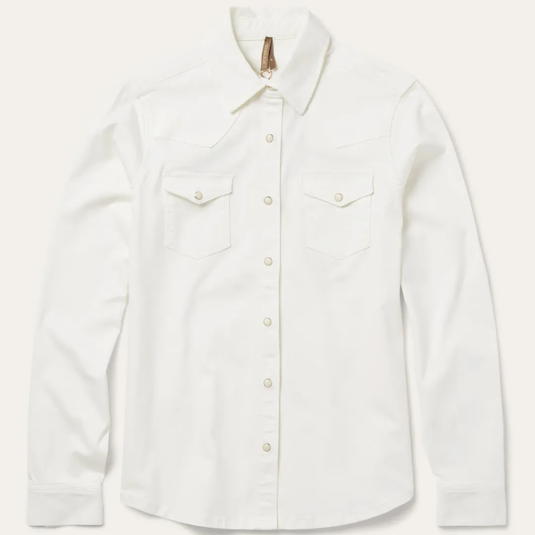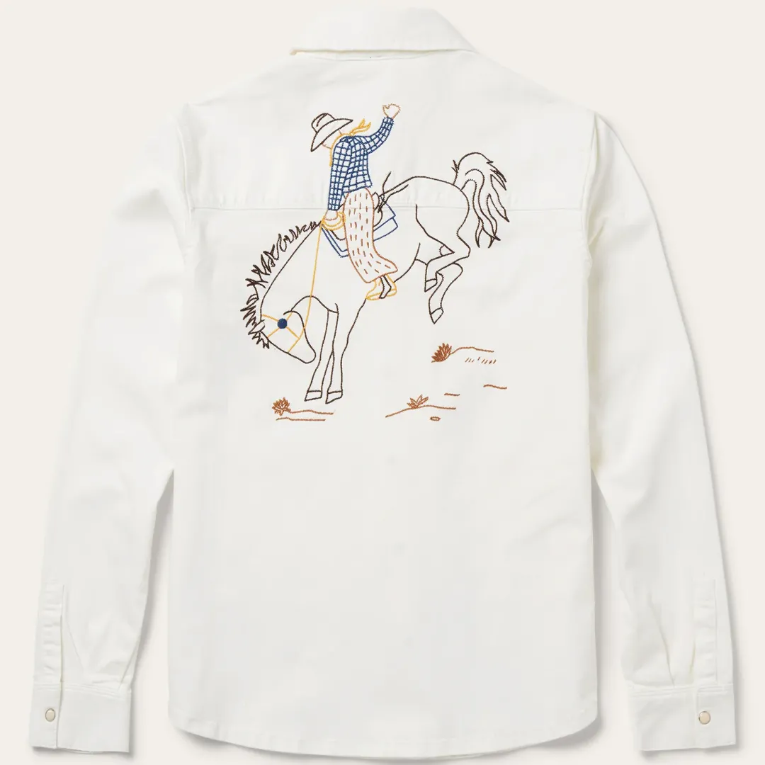 This snap front denim shirt makes a statement with its rich cream color and stunning Western-inspired embroidery. Crafted in a comfortable, flattering boyfriend fit (with just a bit of stretch), it features a single point front yoke, a straight back yoke, single point pockets with flaps and snap closures and a single snap cuff.