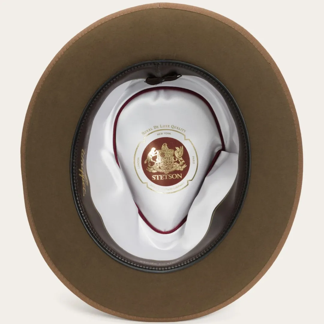 The Whippet Fedora is constructed of firm finish, fur felt and features a pinchfront crown, bound edge brim, interior cowhide sweatband and grosgrain hat band with feather accent.