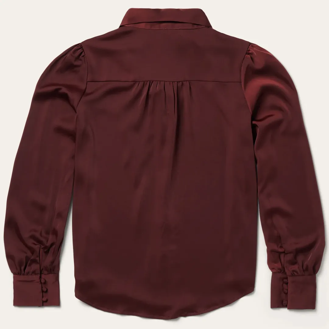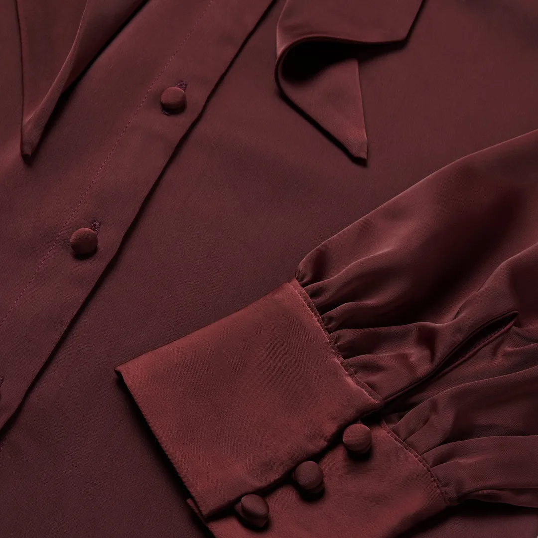 This stylish v-neck satin blouse features a flattering, free-flowing fit for ease of movement and a rich wine color. It has a self-tie collar and self-covered button front placket, straight front and back yokes with gathers below and long sleeves that are gathered into the shoulders. Day or evening, dressed up or with jeans, its versatile style and comfortable feel will make it one of your favorite go-tos.