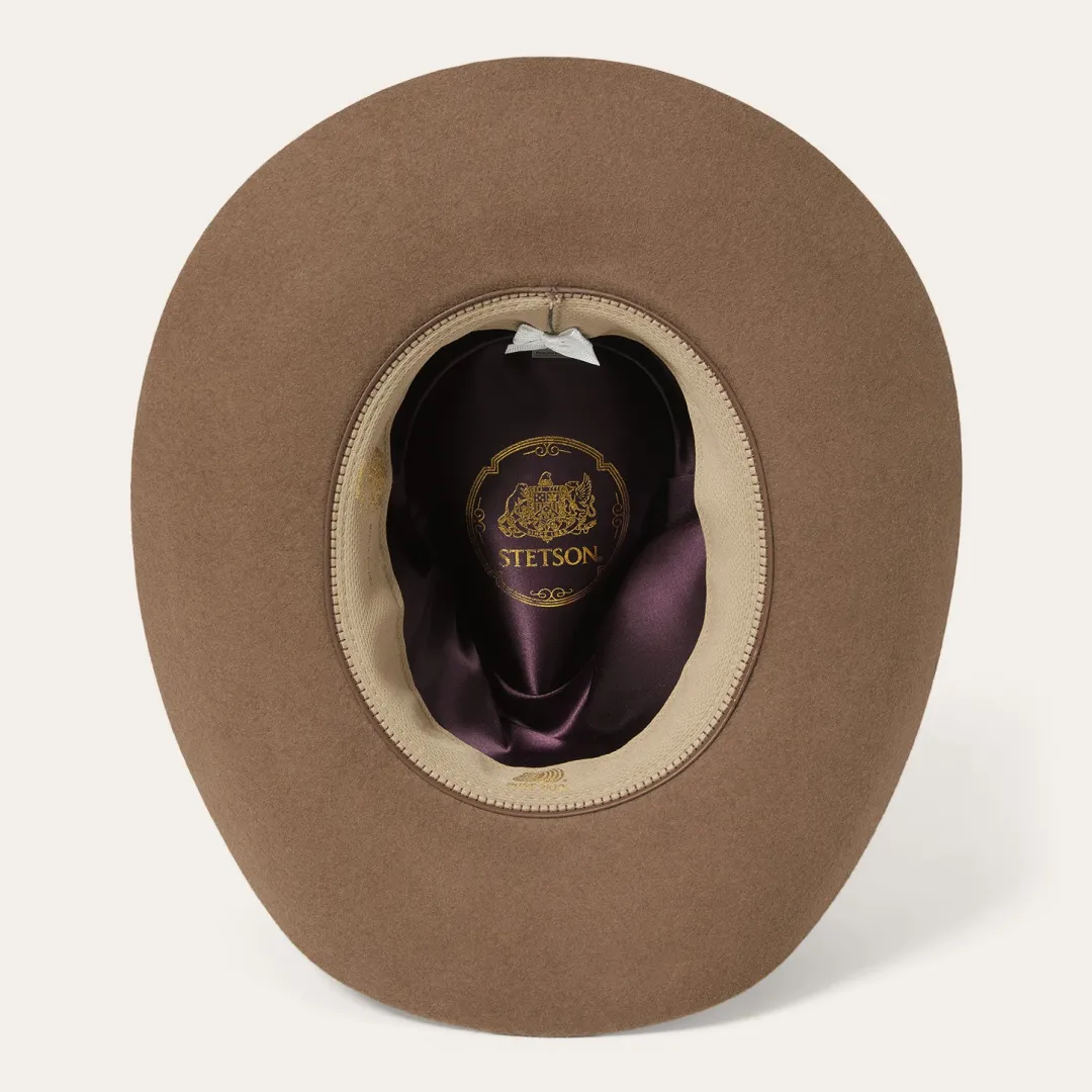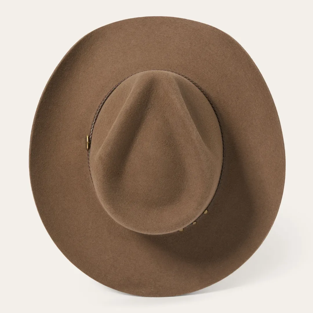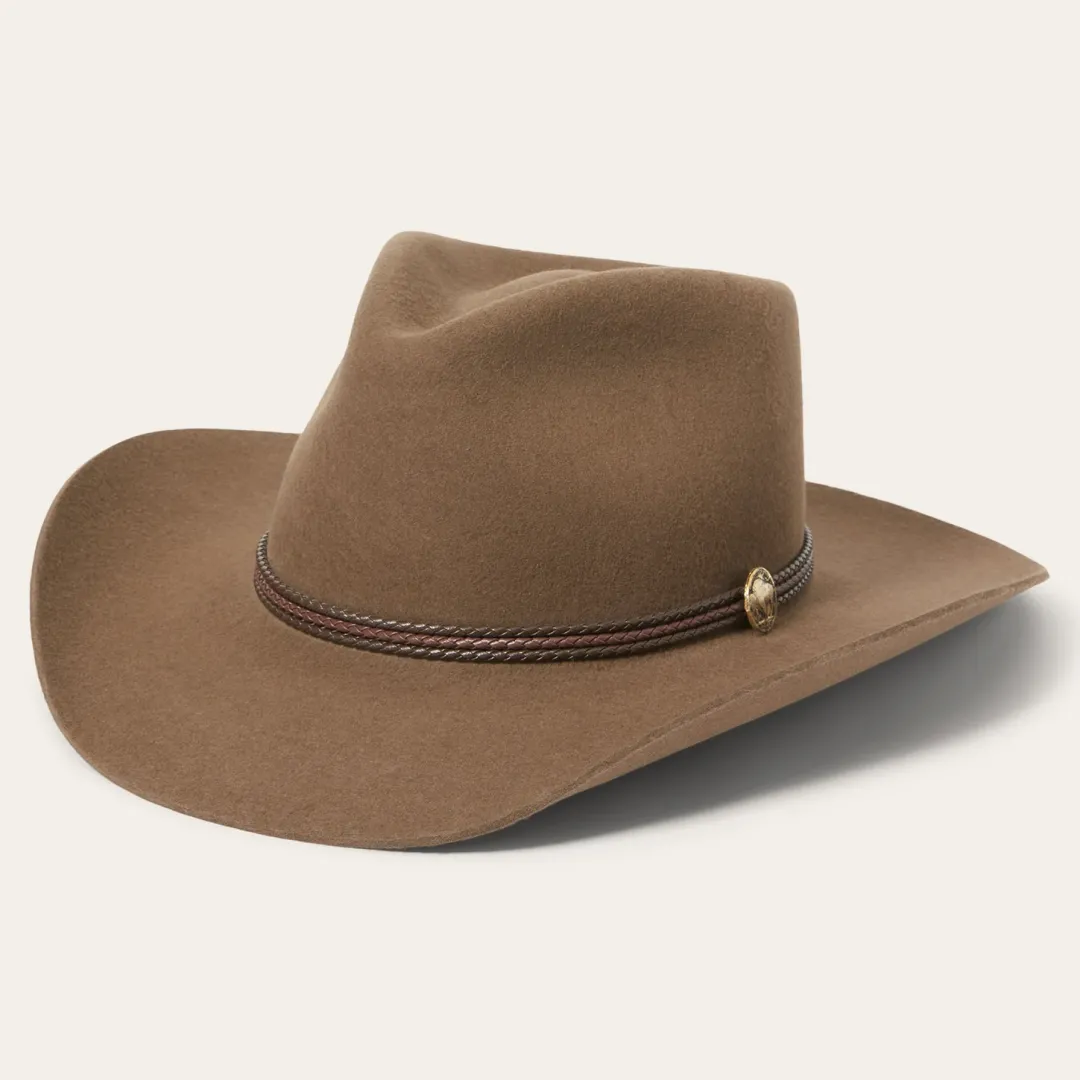 Handmade with pride in Texas, the Woodrow is a statement-making style crafted with a firm finish from high-quality 100% wool felt. It has a 4 1/4” pinch front crown, 3 1/4” brim and a three-cord braided leather hatband and Buffalo nickel pin. A full satin liner provides luxurious comfort and while an absorbent DRI-LEX® sweatband provides a cooling, secure fit.