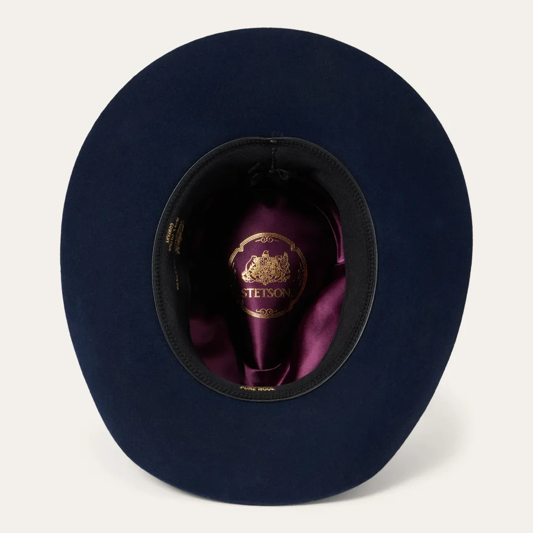 Made with pride in Texas, the Woodrow is crafted with a firm finish from from high-quality 100% wool felt. It has a 4 1/4” pinch front crown, 3 1/4” brim and a three-cord braided leather hatband and Buffalo nickel pin. A full satin liner provides luxurious comfort and while an absorbent DRI-LEX® sweatband keeps things cool.