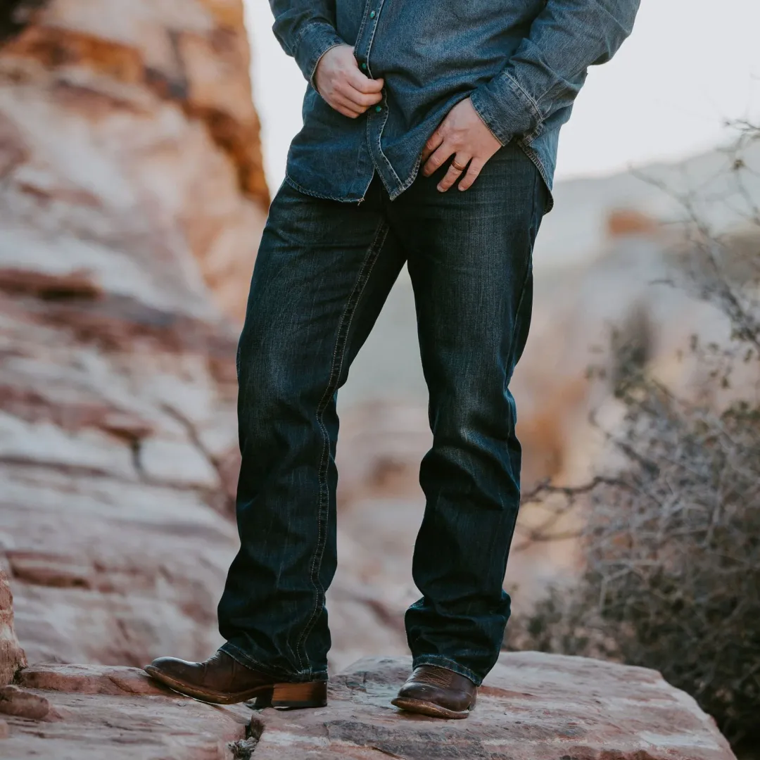Rugged, timeless, practical. These dark wash jeans are cut with a classic, universally flattering fit with a low rise, and they’re relaxed through the thigh before ending in a boot cut leg. The premium denim is naturally tough, and has been hand-sanded, whiskered and tacked for a comfortable feel and authentically worn-in look that only gets better over time.