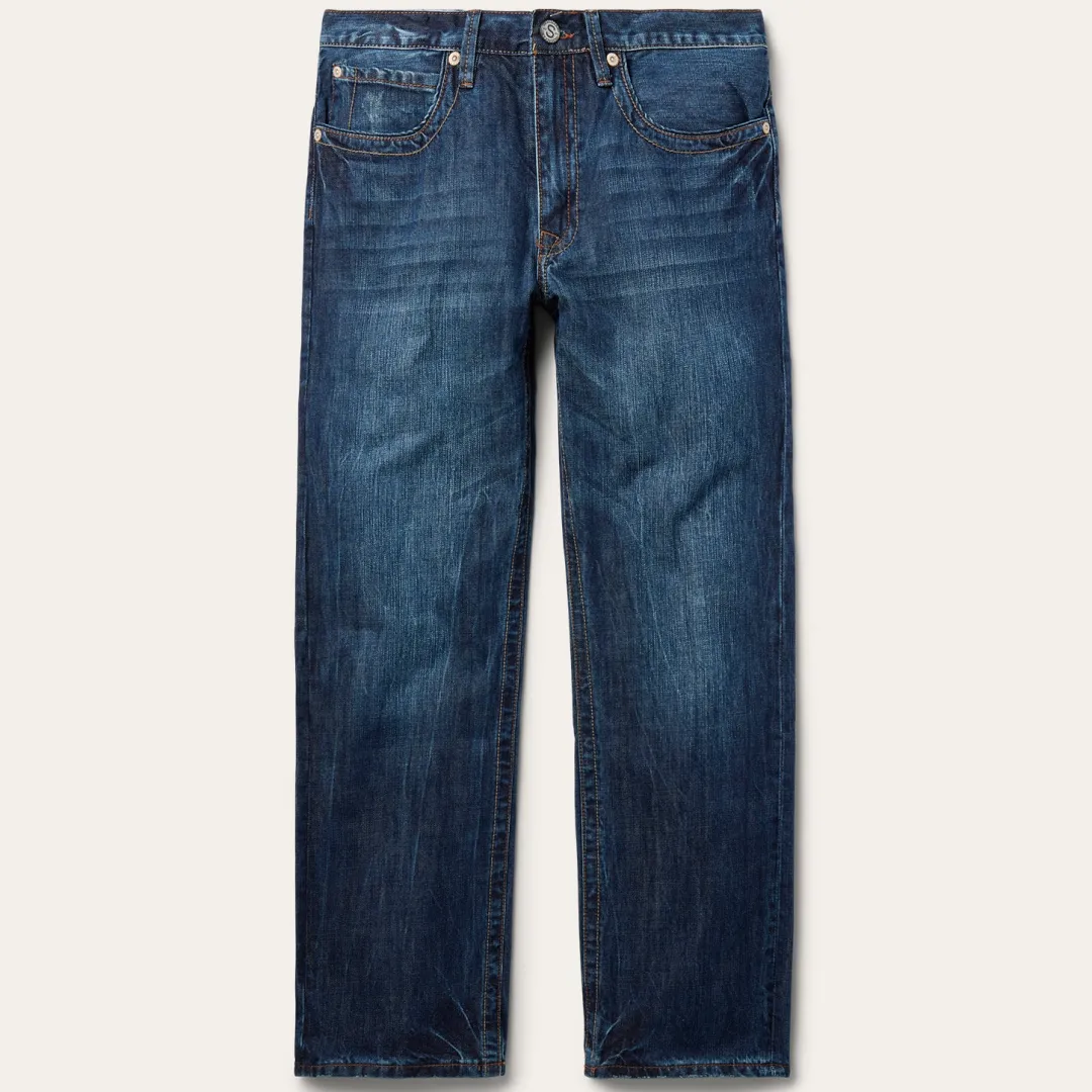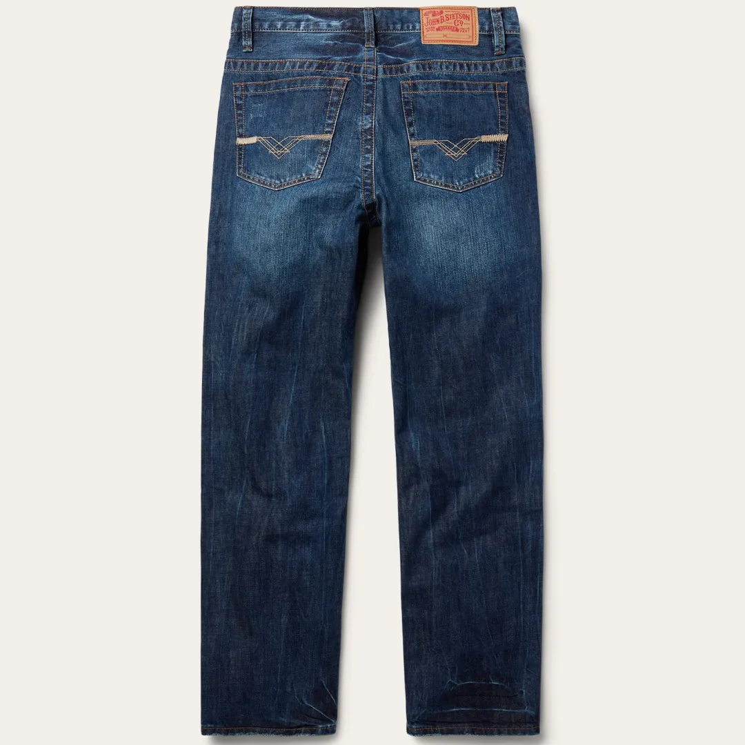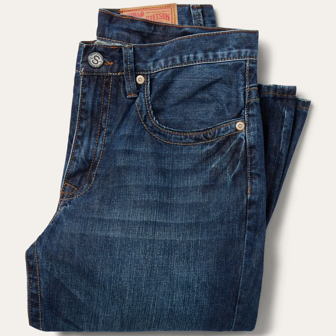 Crafted from 100% cotton denim, these 1520 Standard Fit Jeans have a a mid rise, straight leg, relaxed thigh and bootcut leg opening. The classic 5-pocket style features V-shape heavy contrast deco stitching on the back pockets for a touch of Western-inspired style, along with Stetson branded buttons, rivets, and zipper. Light hand sanding and whisker details complete the jeans for a lived-in look.
