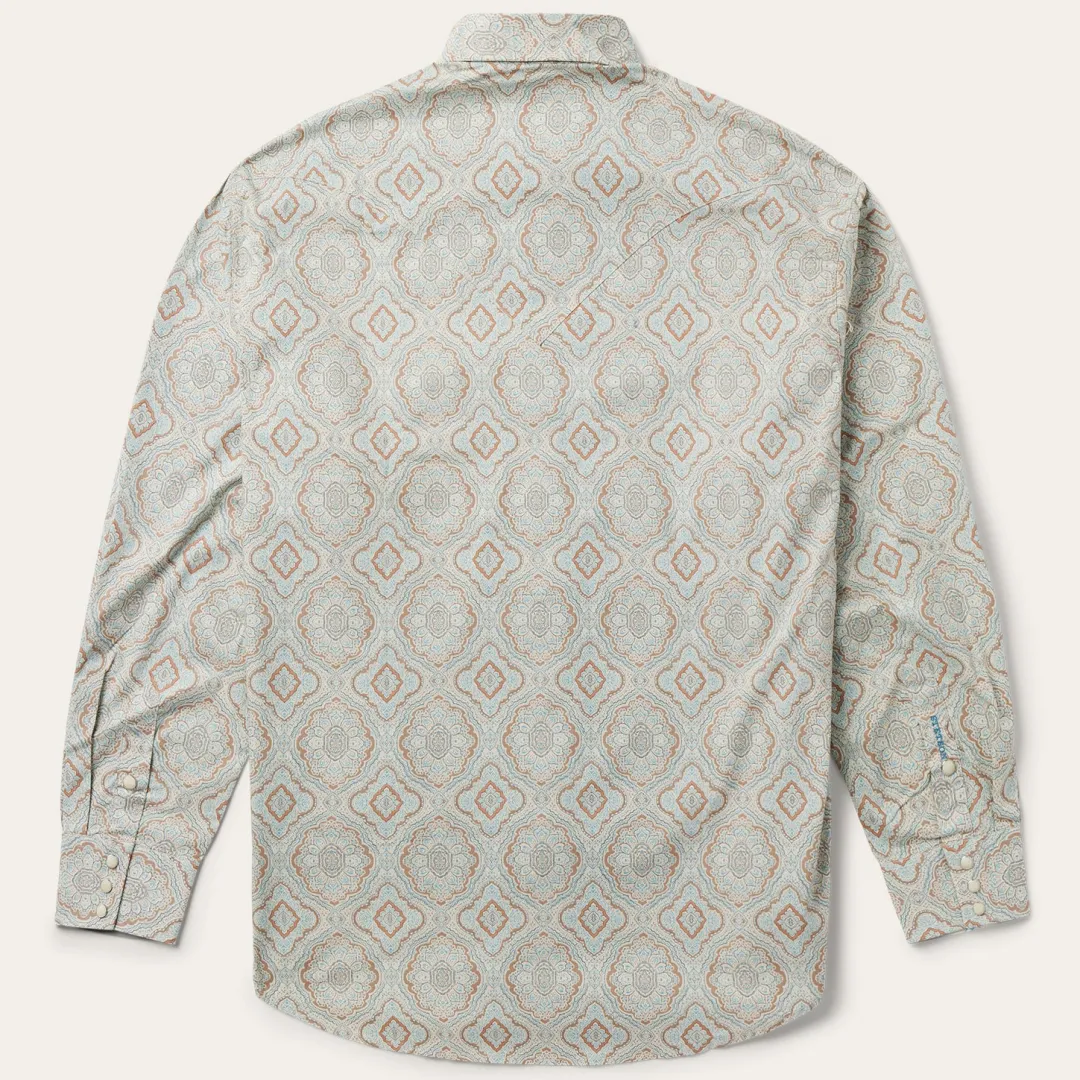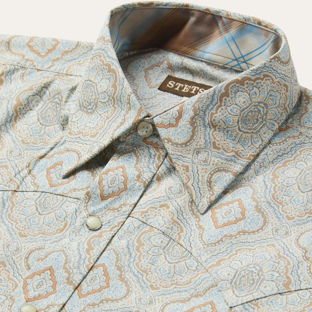 This Western shirt is crafted from a lightweight cotton poplin with a rich Aqua paisley print. It features a one-point curved back yoke, classic snap front featuring opaque logo snaps, and three snap cuffs. The front left pocket is adorned with the Stetson “S” logo and the right sleeve placket is embossed with “STETSON”. It has a contrast inside trim and is crafted with 100% cotton for quality, breathability and comfort.