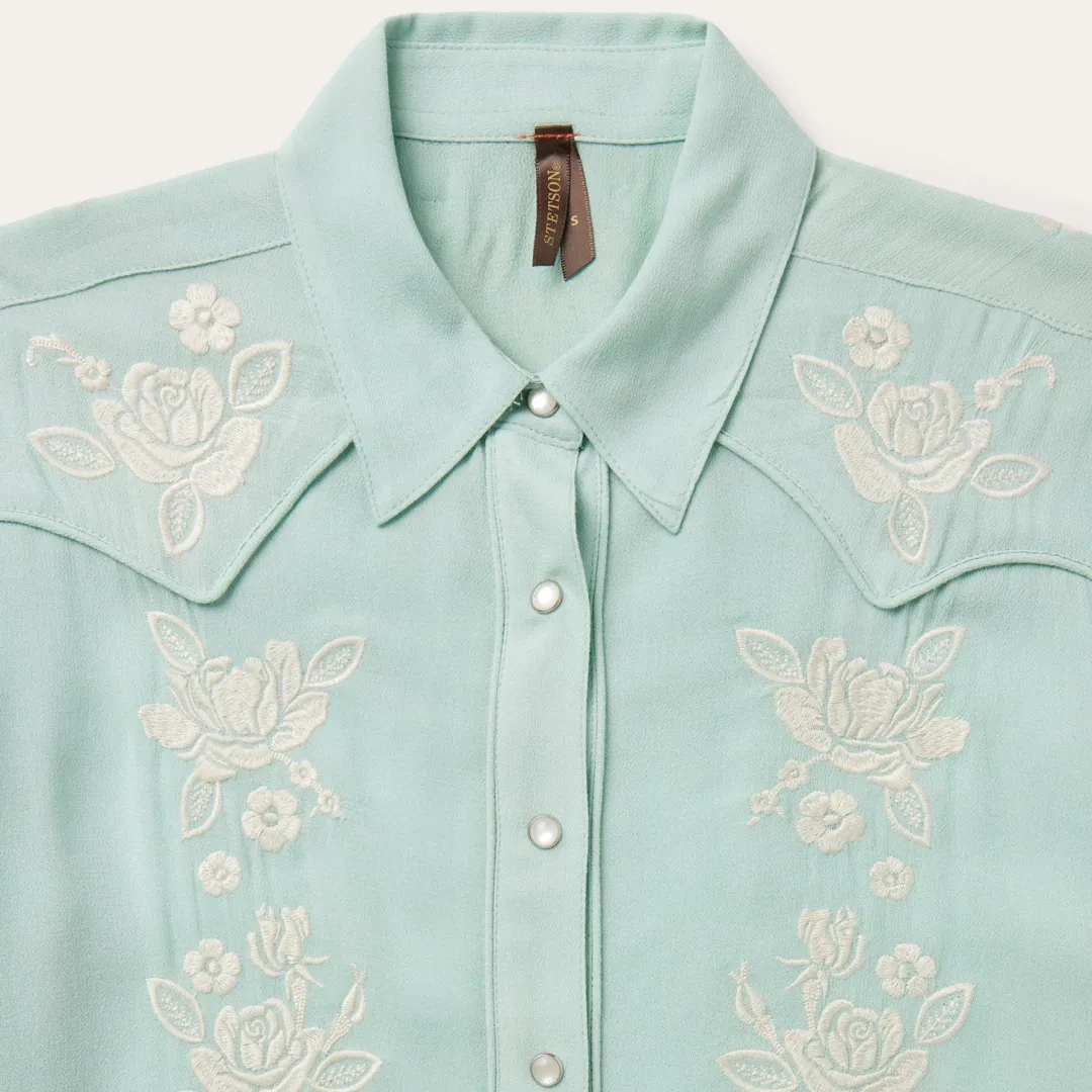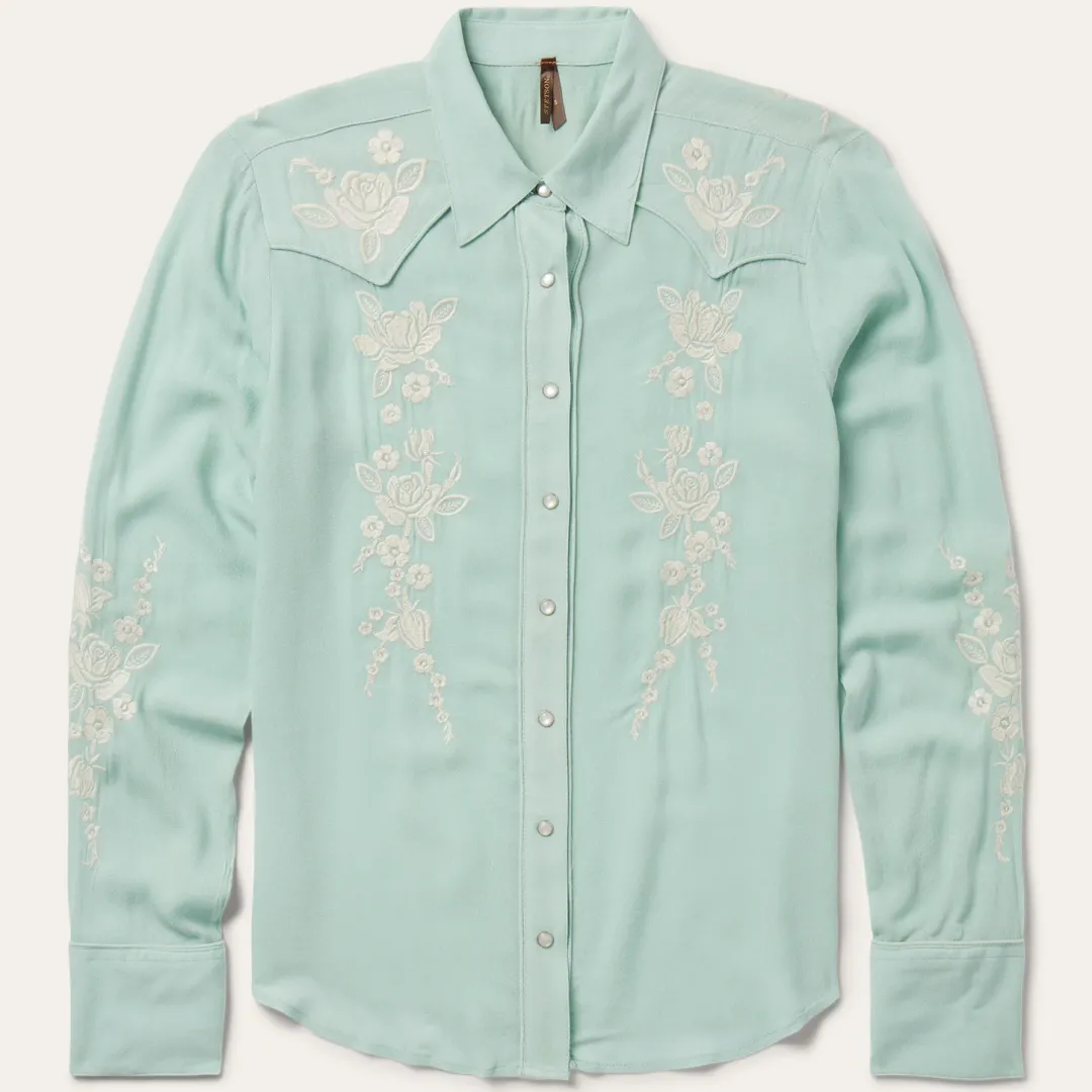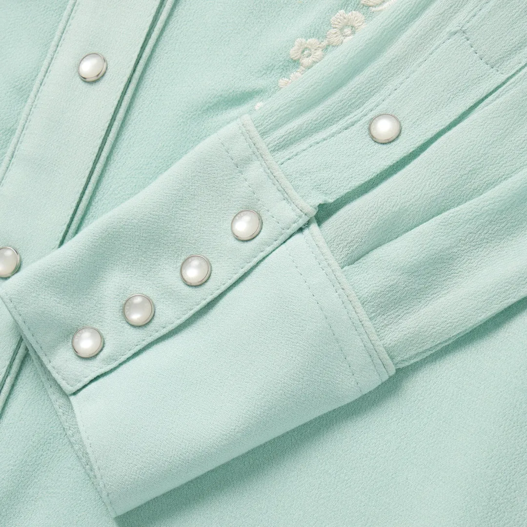 This stylish western-inspired blouse is crafted from soft 100% rayon crepe. It has a single point curved front yoke and deep back yoke, along with an eye-catching floral embroidered detail and self-piping. Cut with an easy, flattering drape, the blouse allows for all-day comfort and freedom of movement.