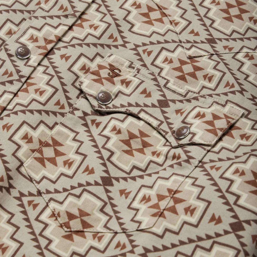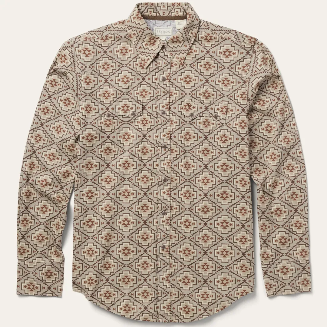 We set the standard for snap fronts. They’re not just Western-inspired, they’re imbued with a Western spirit. This modern fit shirt is crafted from crisp, breathable 100% cotton poplin that has been yarn-dyed for rich, lasting color and made to get better with age and wear. Featuring our exclusive all-over brown aztec print, it has a two-point curved back yoke, two-point curved pocket flaps, twill tape inside trim, subtle “S” and “Stetson” embroidery at the chest and right sleeve placket, a three-snap cuff and a classic snap front featuring opaque logo snaps.