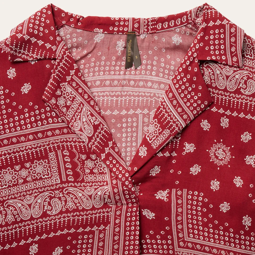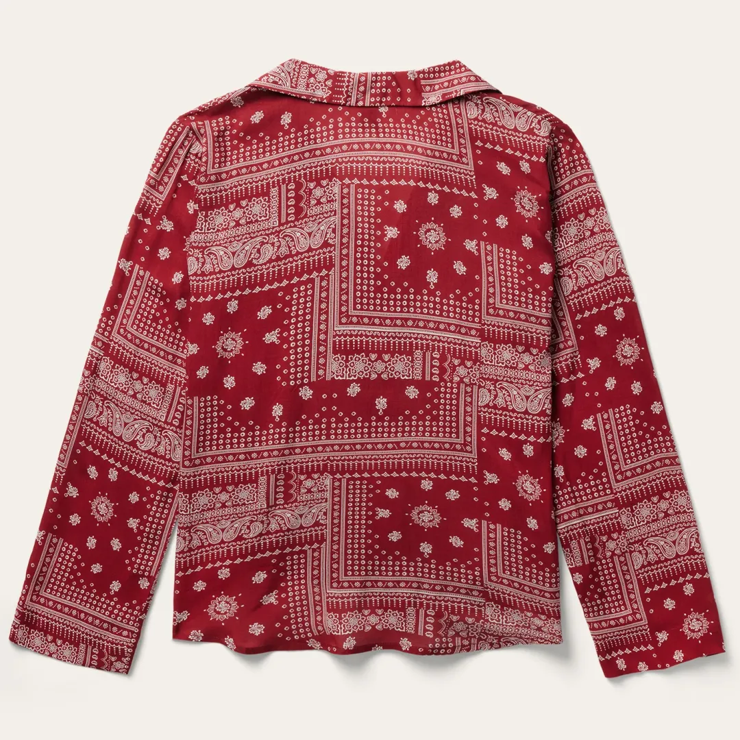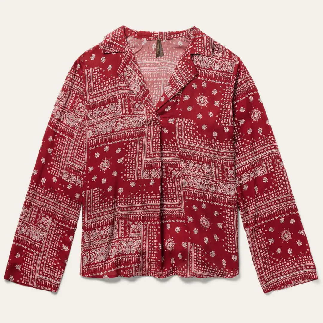 This pullover blouse is crafted from soft, smooth 100% rayon and features a Western-inspired allover Red Bandana Patchwork print. It has a flattering open notch collar V-neck and long sleeves with a slight bell. The large pleat at the center front creates a slimming effect, while the relaxed fit and lightweight fabric ensure all-day comfort and freedom of movement.