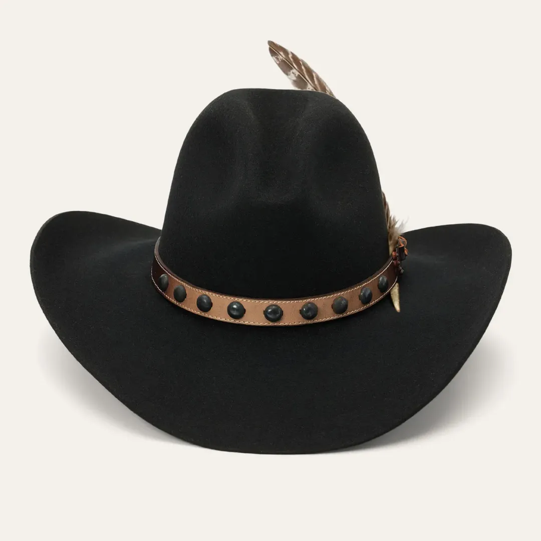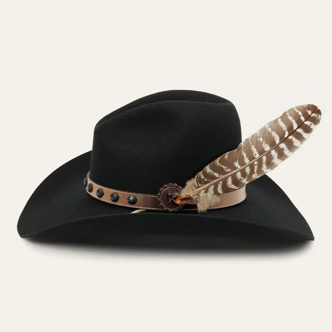 Handmade in the U.S.A. of durable, weather-resistant 4X quality buffalo felt, the Broken Bow 4X features an iconic 4″ x 5″ sloped Gus crown with a cattleman crease and a 4 3/8″ brim. Its rugged style is augmented by a leather hat band with antique brass-tone studs and side tie and a removable turkey feather detail. Finished with a full satin liner and genuine leather sweatband for a comfortable, secure fit, it includes an original Stetson hat box.