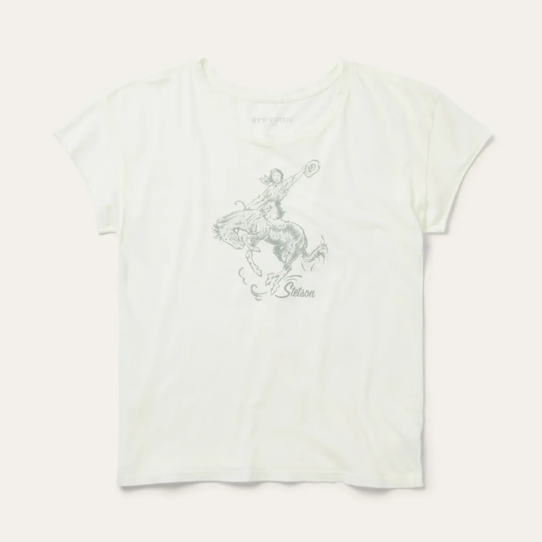 With easy style and maximum comfort, our graphic tees are made from airy 100% cotton and screen-printed with custom signature graphics. This vintage-inspired white tee has been gently distressed and garment washed, giving it the perfect worn-in look and feel. It features slight drop shoulders, raw edge short sleeves and a transparent charcoal-colored bucking cowgirl print.