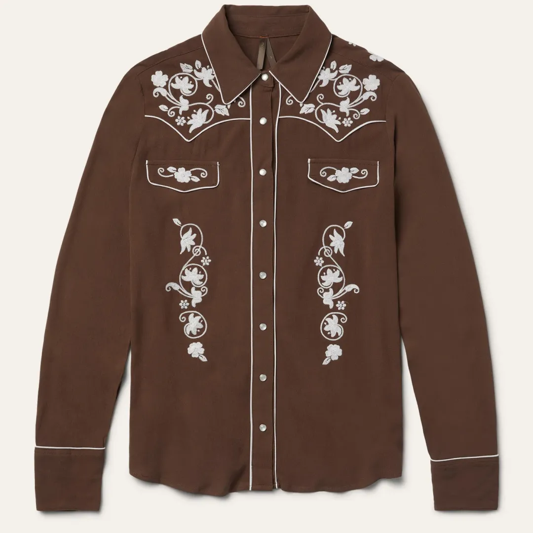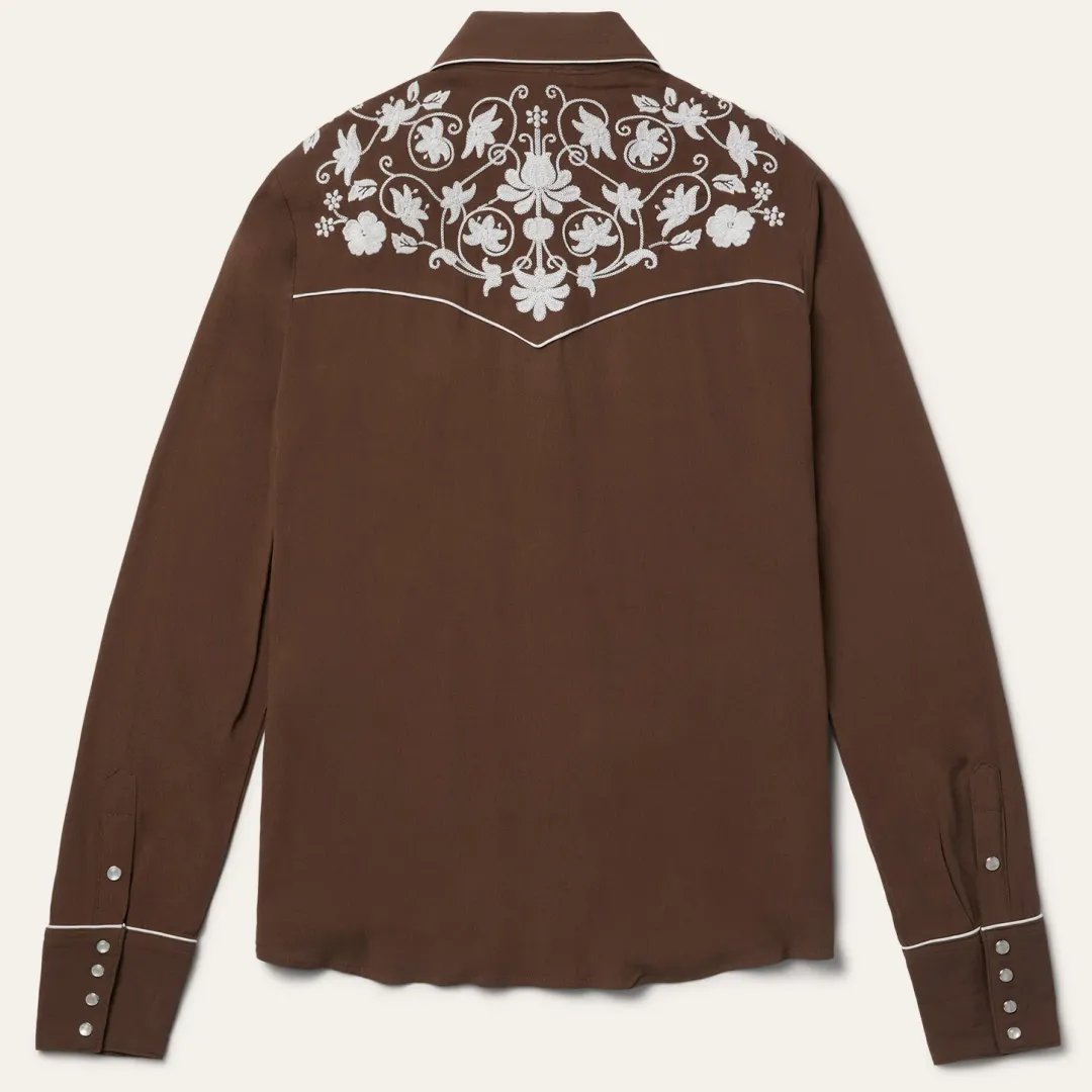 This snap-front western shirt offers classic style with heritage details like contrast piping and embroidery. It’s constructed with extremely soft rayon crepe and features a single-point front and back yoke, an oversized collar with piping, and smile pockets. This shirt is equally at home out on the ranch or out on the town.