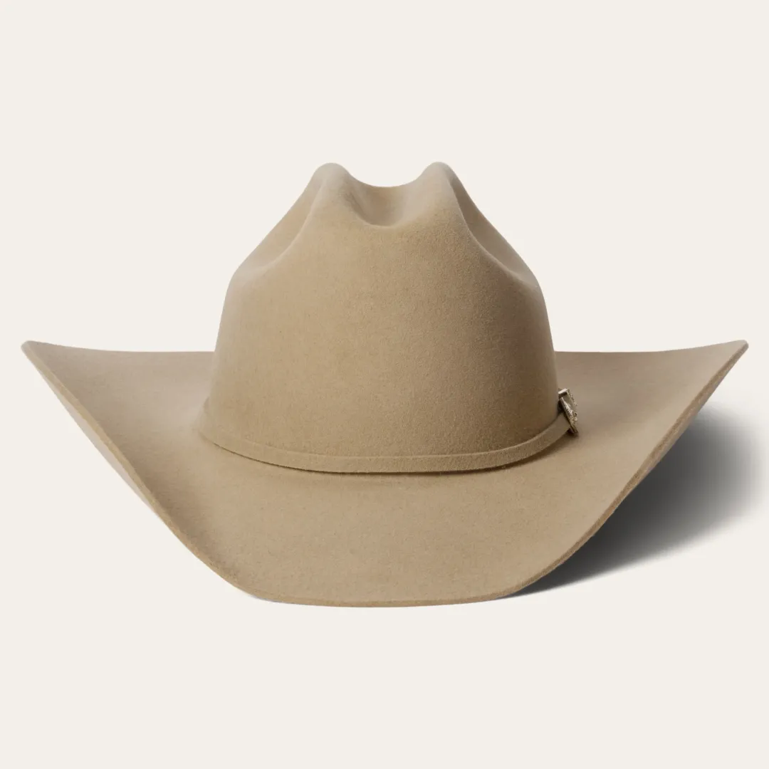 Part of our Buffalo collection, this cowboy hat is made in the USA of high-quality, weather-resistant 4X buffalo felt. Its classic Western profile features a classic cattleman crease, a 4″ brim and a 4 1/2” regular oval crown. Additional details include a leather sweatband, satin lining, and a self-matching hat band with a three-piece silver-toned buckle set, as well as a Stetson hat box.