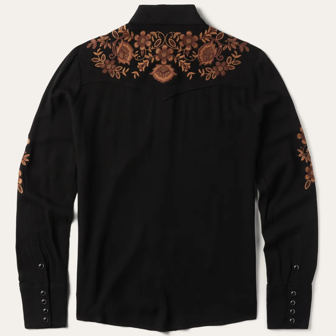 This long-sleeve black Western blouse is crafted from soft, smooth 100% rayon and features eye-catching floral embroidery. It features tonal piping on its oversized collar, single point front and back yokes, front placket and cuffs and contrast piping on its two smile pockets. Lightweight and breathable, it has an easy, elegant drape and a flattering, flowing fit that allows for freedom of movement.