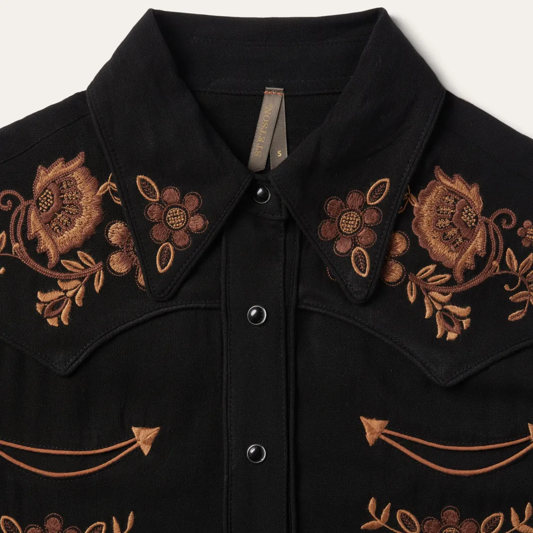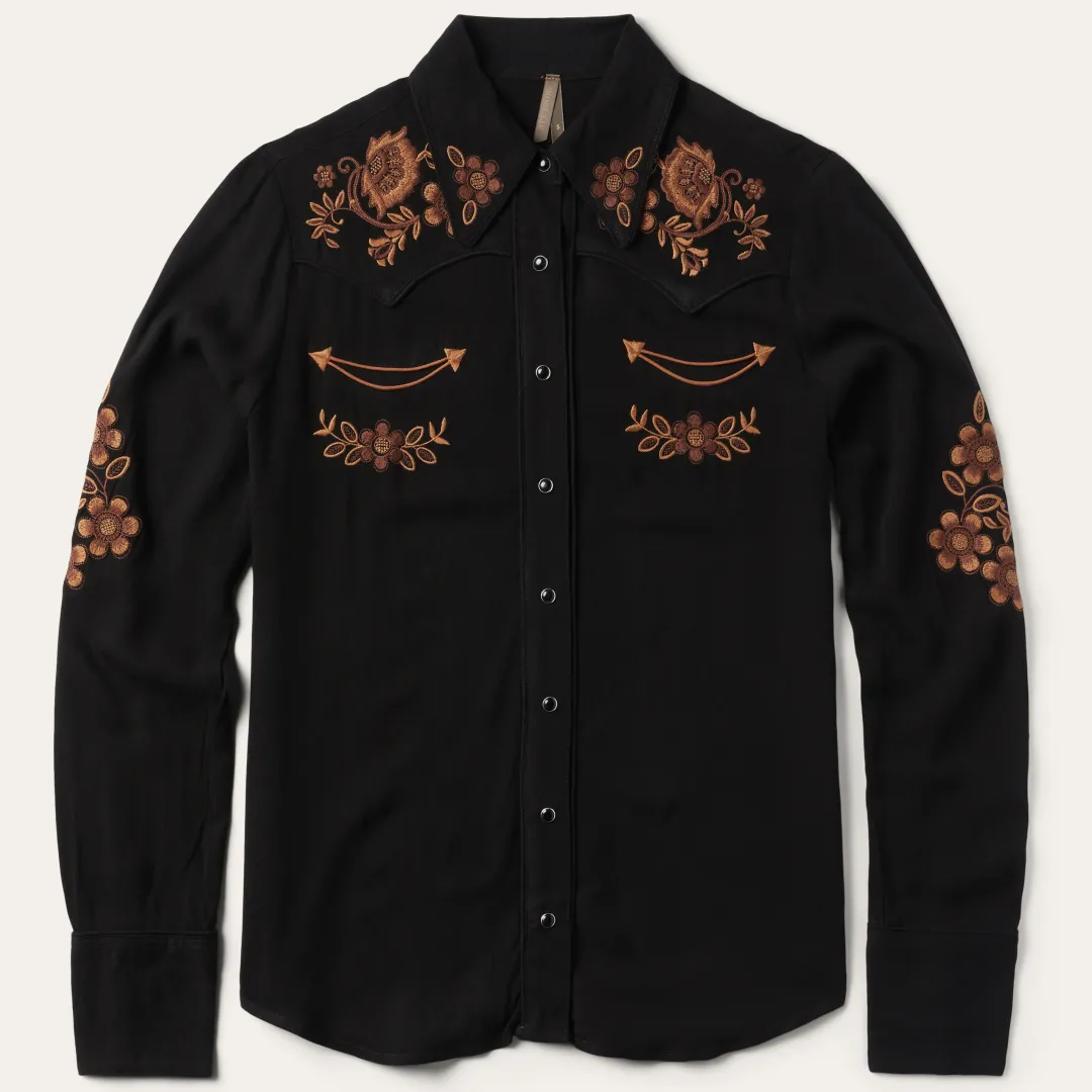 This long-sleeve black Western blouse is crafted from soft, smooth 100% rayon and features eye-catching floral embroidery. It features tonal piping on its oversized collar, single point front and back yokes, front placket and cuffs and contrast piping on its two smile pockets. Lightweight and breathable, it has an easy, elegant drape and a flattering, flowing fit that allows for freedom of movement.