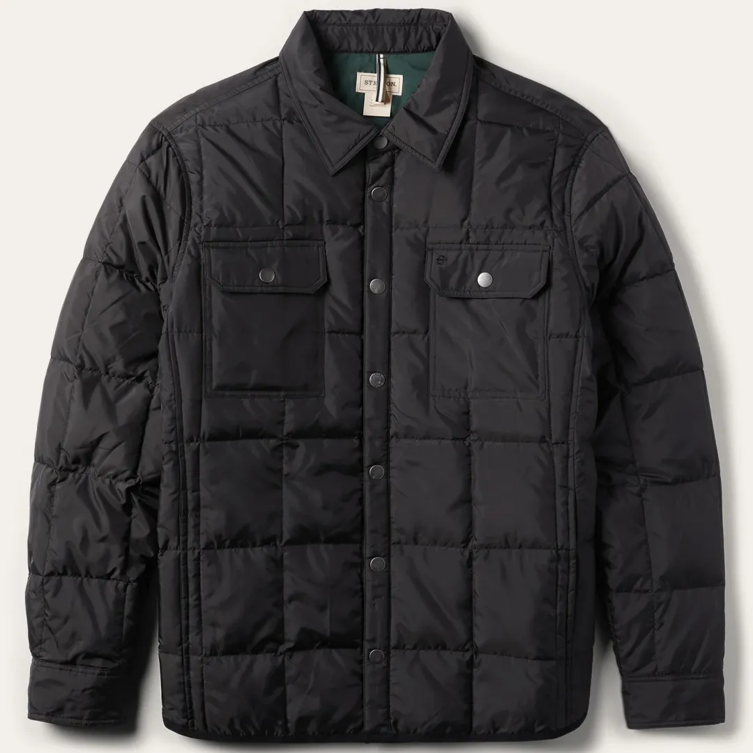 This versatile jacket is lightweight and fully crushable for easy traveling. Filled with down. it has a high warmth to weight ratio so you’re always prepared if the weather goes south. The neutral pure black exterior pairs with anything, while the hunter green interior provides a subtle contrast. Further details include welt pockets, adjustable snap cuffs and a snap front with antique nickel snaps.