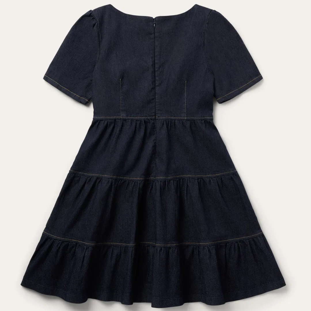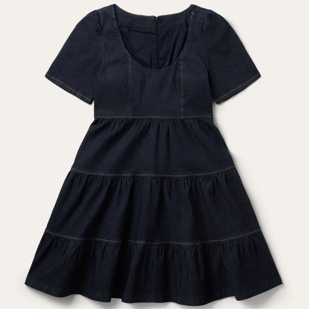 A stylish and versatile piece for any wardrobe, this dark denim dress is crafted from a soft cotton blend with just a hint of stretch for ease of movement and has been garment washed for a comfortable feel. It features a princess seamed empire bodice and three-tier skirt, short sleeves that are gathered at the shoulders, and an invisible back zipper to ensure a perfect fit. Contrast top stitching adds authentic Western-inspired style, while the above-the-knee length allows plenty of room for Western boots.