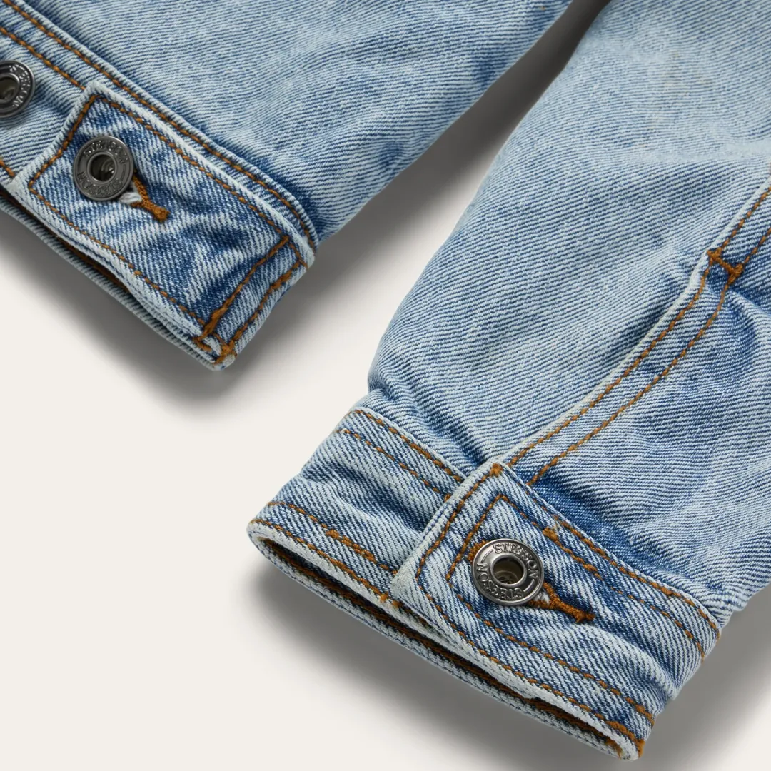With a sun-faded wash and high-contrast yellow stitching, this sherpa-lined denim jacket provides extra warmth along with classic Western details throughout. It features two front welt pockets, front and back seams, a straight front and back yoke, single-point pockets, flaps and cuffs and back waist tabs. Durable, dependable and always in style, a great denim jacket is the perfect layer for in-between seasons and a go-to for nights on the town.