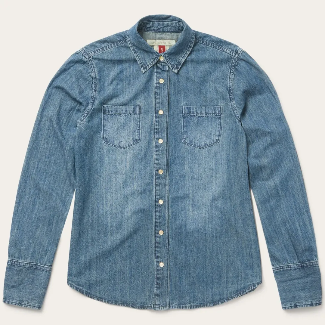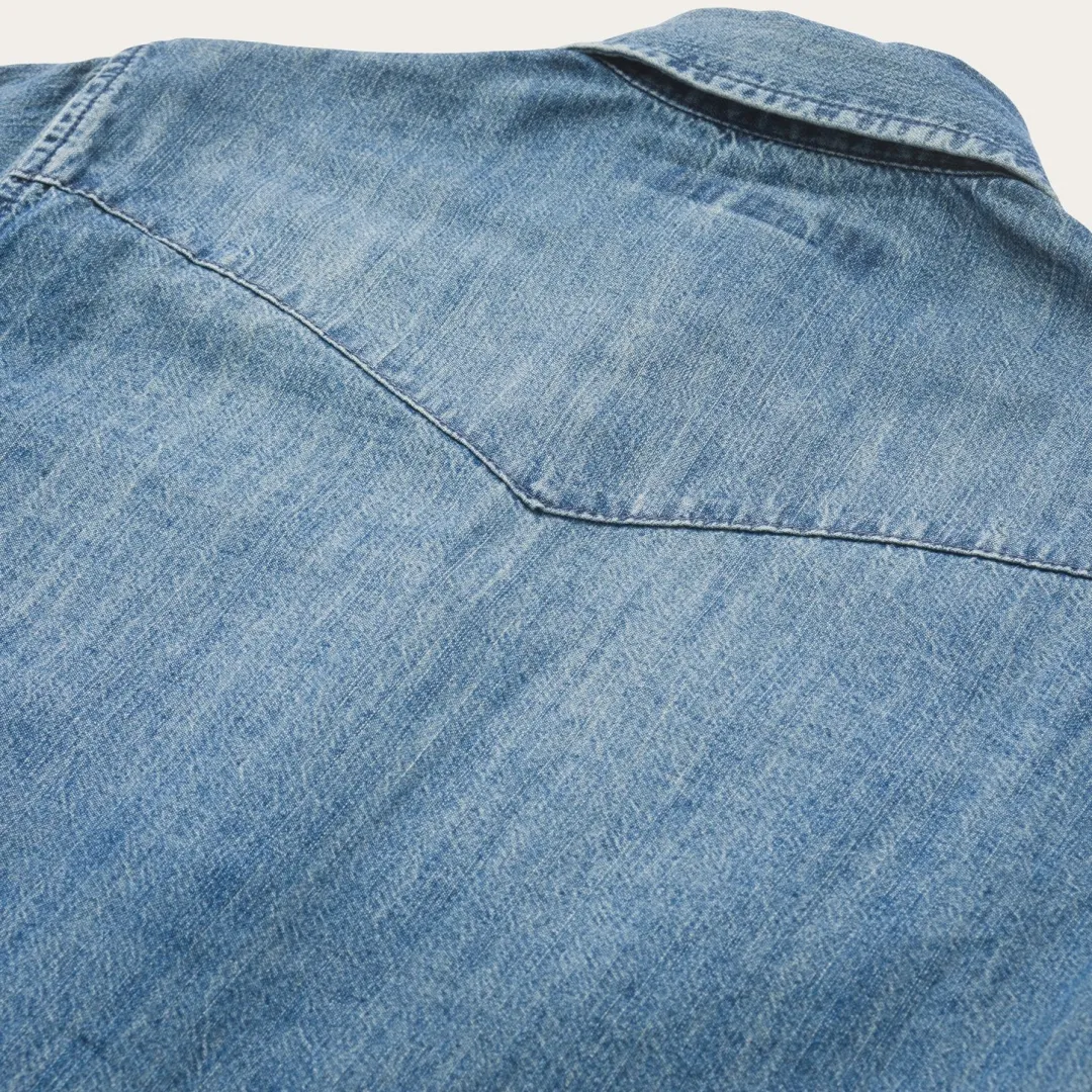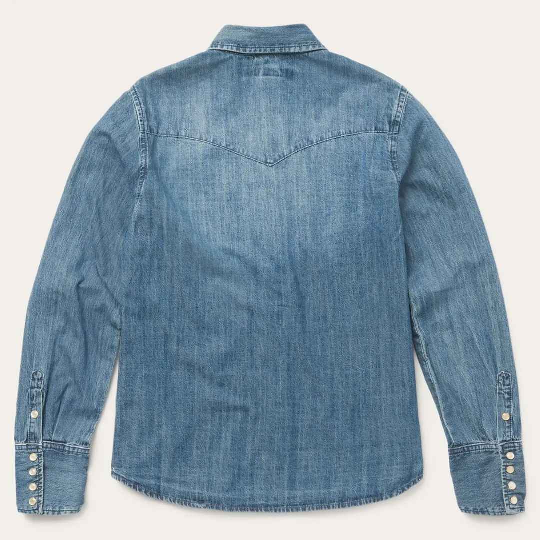 The Denim Snap Front Western Shirt features a boyfriend fit, double single point front patch pockets, single point back yoke and four snap cuffs.