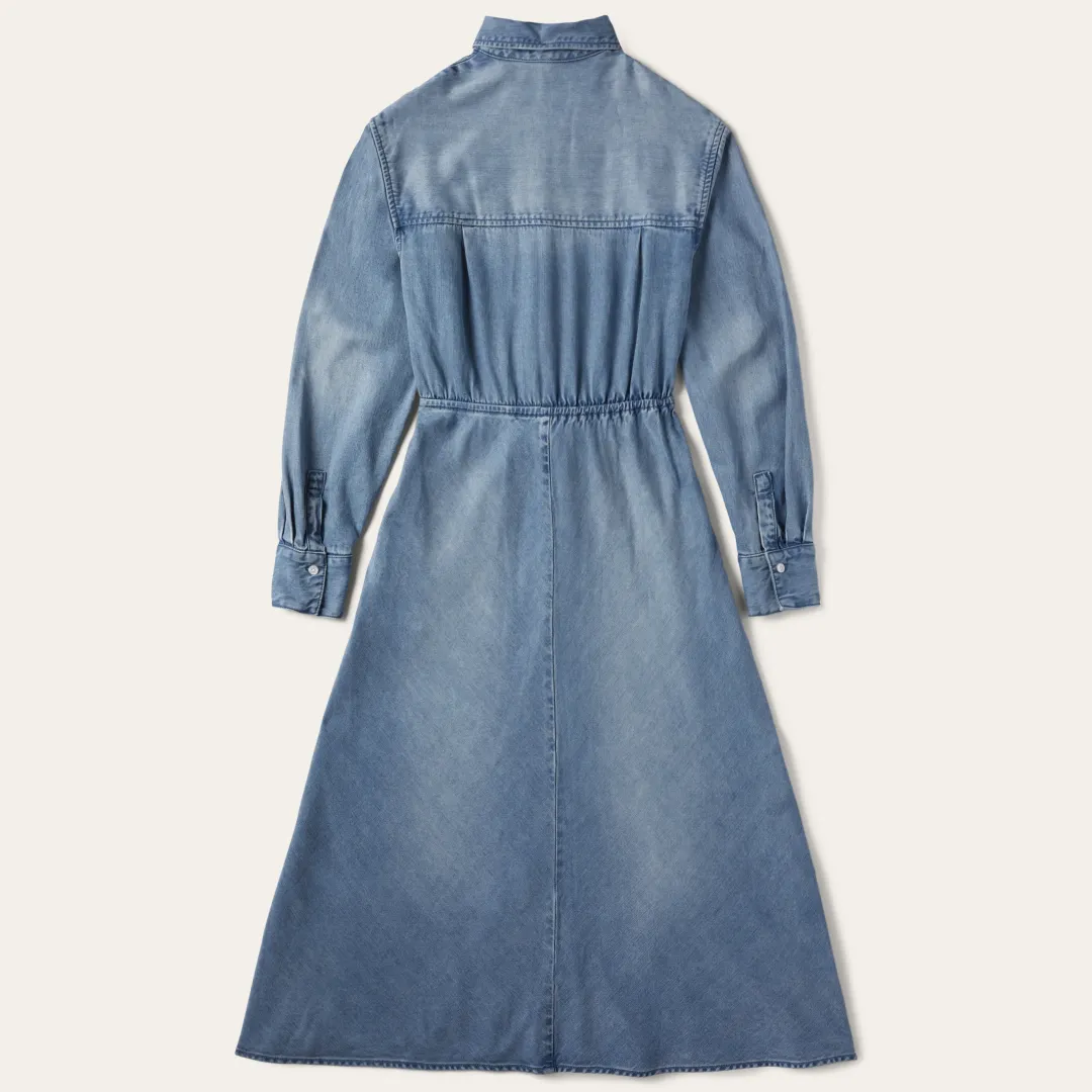 Inspired by your favorite denim shirt, this long-sleeve, mid-length dress features a button-front bodice closure, an elastic back waistline with gathers and a self-tie waist. It has a fold-down collar, pleated and cuffed sleeves and two side seam pockets. Made from sustainable Tencel denim, it pairs equally well with a cowboy hat and boots as it does with a sun hat and sandals.