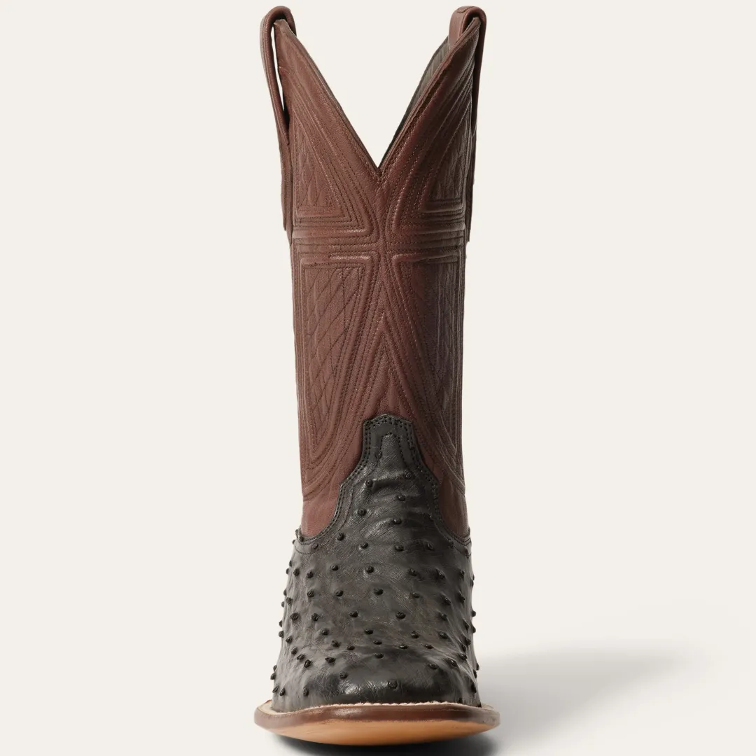 The Dillon Ostrich Boots have a black full ostrich vamp and 13” brown leather vamp. Additional features include premium leather lining, removable Poron insoles, premium brass nails and hand-driven lemonwood pegs that enable the boot to withstand the elements by expanding and contracting with any moisture the boot may encounter.Our exotic western boots are handcrafted with the same care and consideration that goes into our legendary headwear, resulting in the ultimate mix of heel-to-toe comfort, durability, and classic Western style. Their rugged construction is fit for a lifetime of adventure, with high-quality exotic leathers that will develop an attractive patina over time and conform to the wearer, providing years of reliable service.