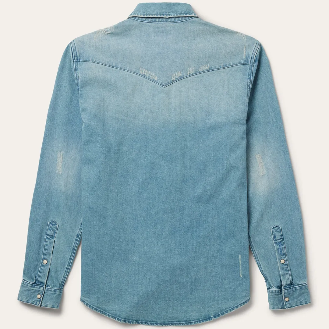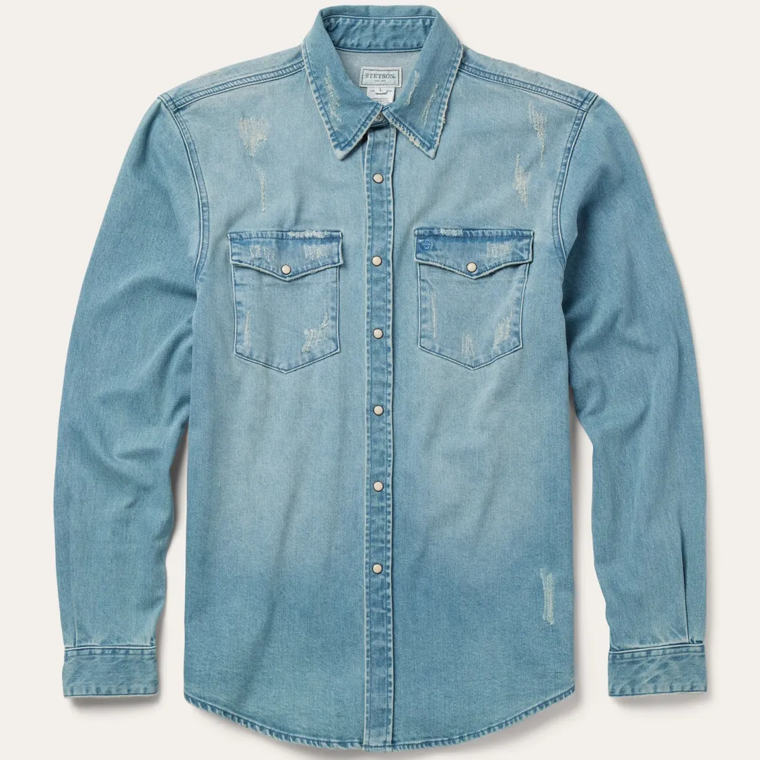 A tried-and-true Western classic in a fitted, modern cut—this is the kind of resilient and dependable shirt you’ll reach for every morning. It’s made from 100% cotton denim that’s been distressed throughout the garment, giving it a lived-in look and features a broken-in feel that only gets better with age. Two snap-closure pockets, a spread collar, and a one-point ultra deep back yoke give this button-down the perfect dose of character.Iconic Western details include Stetson-branded opaque snap buttons on the front placket, cuffs, and pockets, as well as custom embroidery on the chest and right cuff. Exceedingly durable and always comfortable, it’s a rugged essential for all seasons.