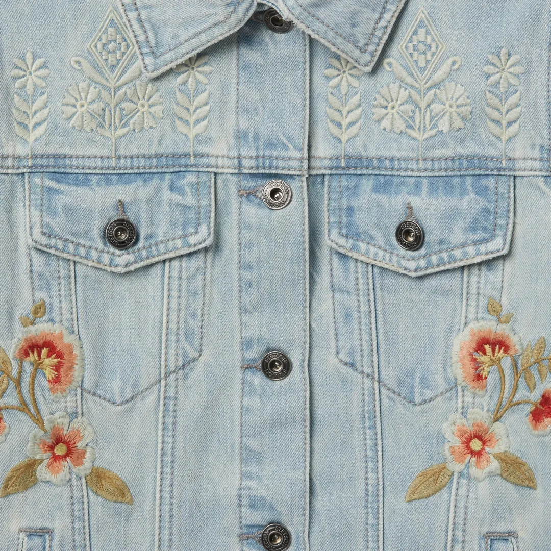 The denim jacket is a true essential, a storied piece of authentic Western outerwear. This version adds flower embroidery for a playful and feminine take on a classic. Finished with authentic details like back waist tabs, flap chest pockets, and metal buttons throughout. Sure to be a favorite throughout the season, and in seasons to come.