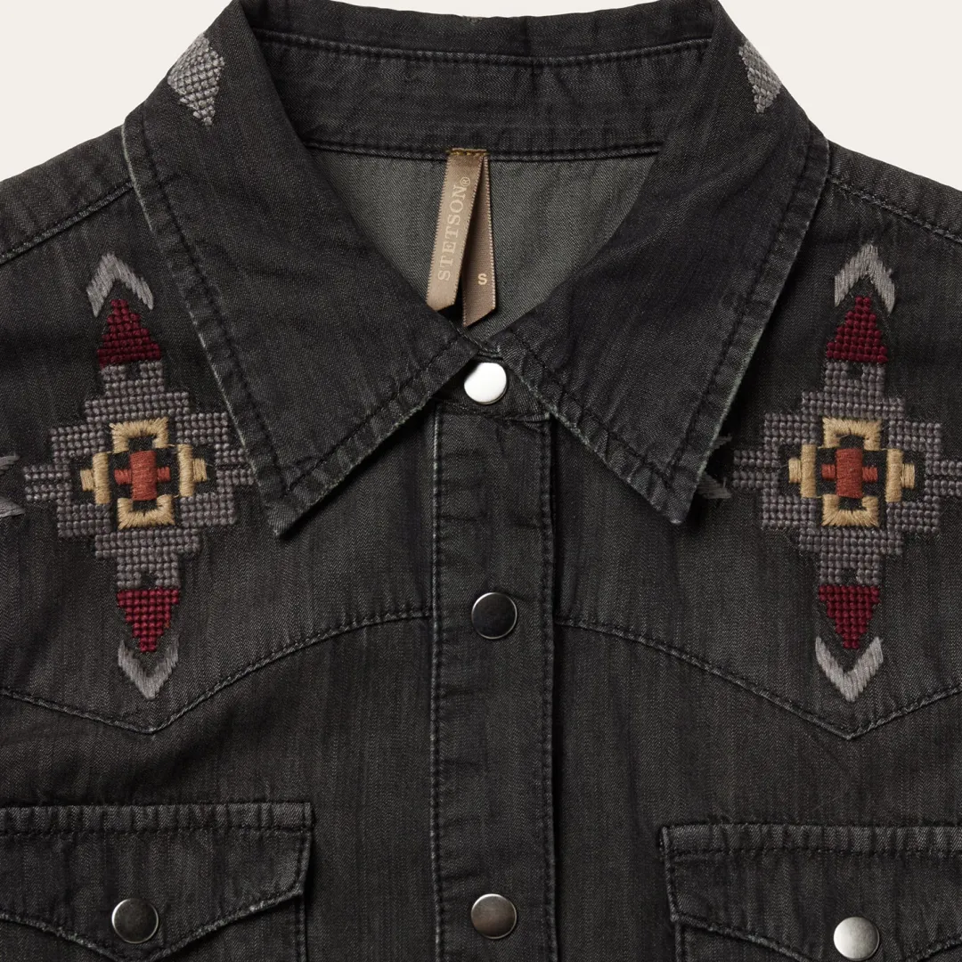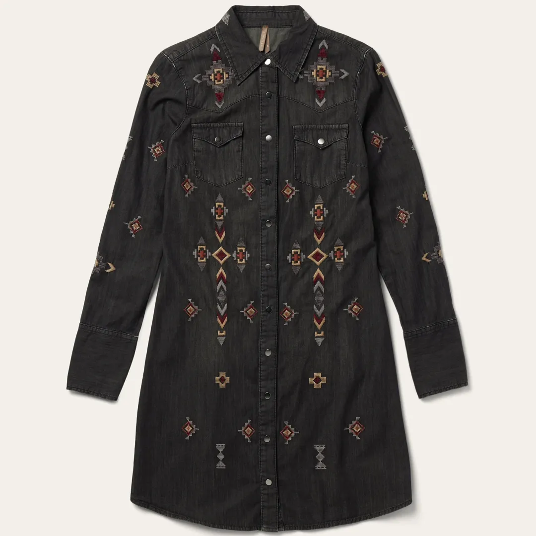 This long sleeve black denim shirt dress is crafted from 100% cotton that has been garment washed for a soft, comfortable feel that will only get better with time. Featuring a stunning all-over embroidered detail, it includes single point front and back yokes, single point front pockets with flaps and snap closures, five snap cuffs and a classic snap front. Its versatile, Western-inspired style can be worn on its own with boots or over a t-shirt and jeans.