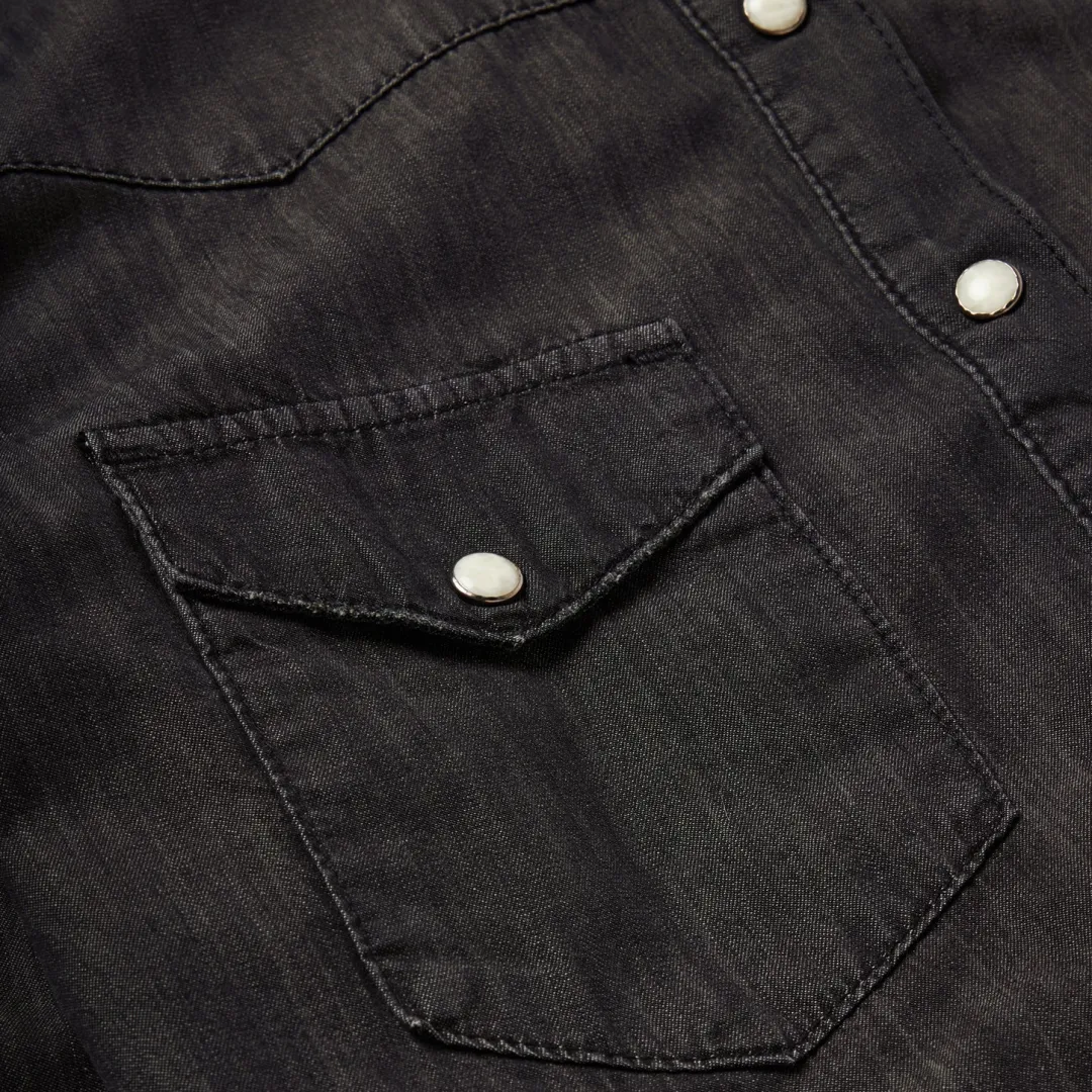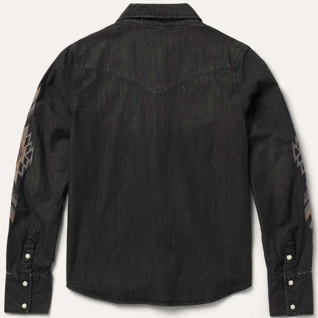 This long sleeve black denim shirt is crafted from 100% cotton that has been garment washed for a soft, comfortable feel that will only get better with time. Featuring a stunning embroidered detail on both sleeves, its Western-inspired style features include curved single point front and back yokes, patch front pockets with flaps and snap closure, three snap cuffs and a classic snap front.