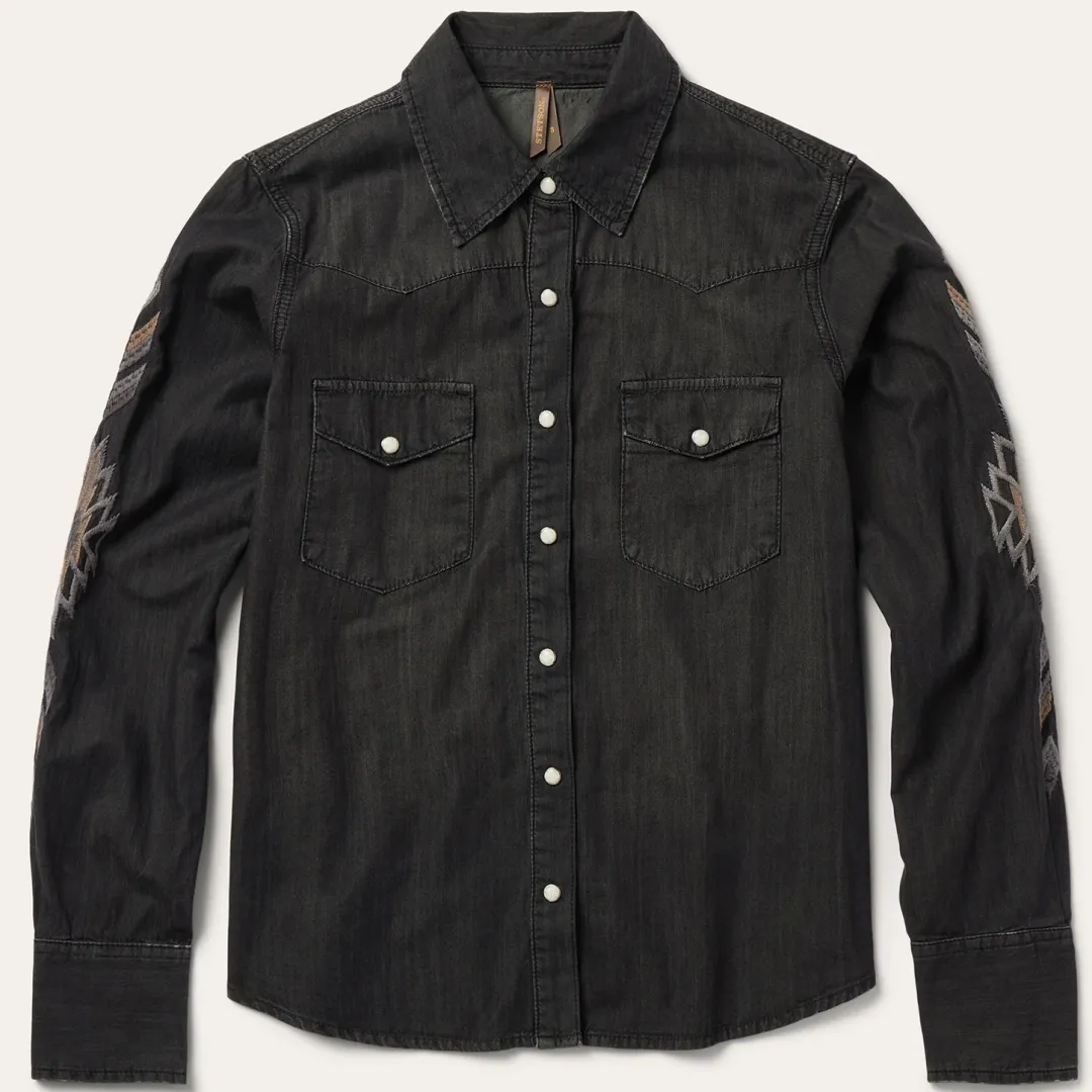 This long sleeve black denim shirt is crafted from 100% cotton that has been garment washed for a soft, comfortable feel that will only get better with time. Featuring a stunning embroidered detail on both sleeves, its Western-inspired style features include curved single point front and back yokes, patch front pockets with flaps and snap closure, three snap cuffs and a classic snap front.