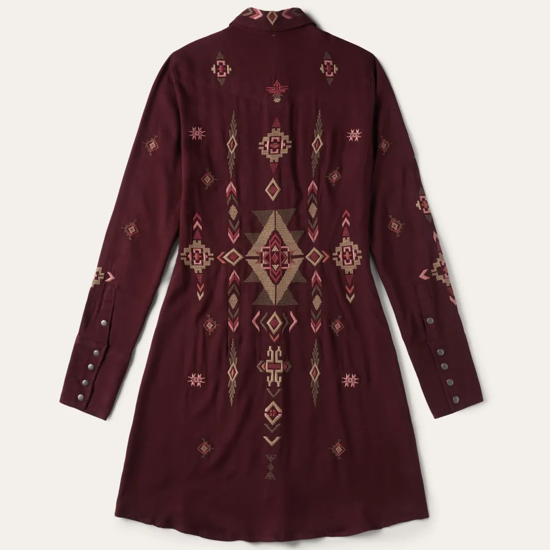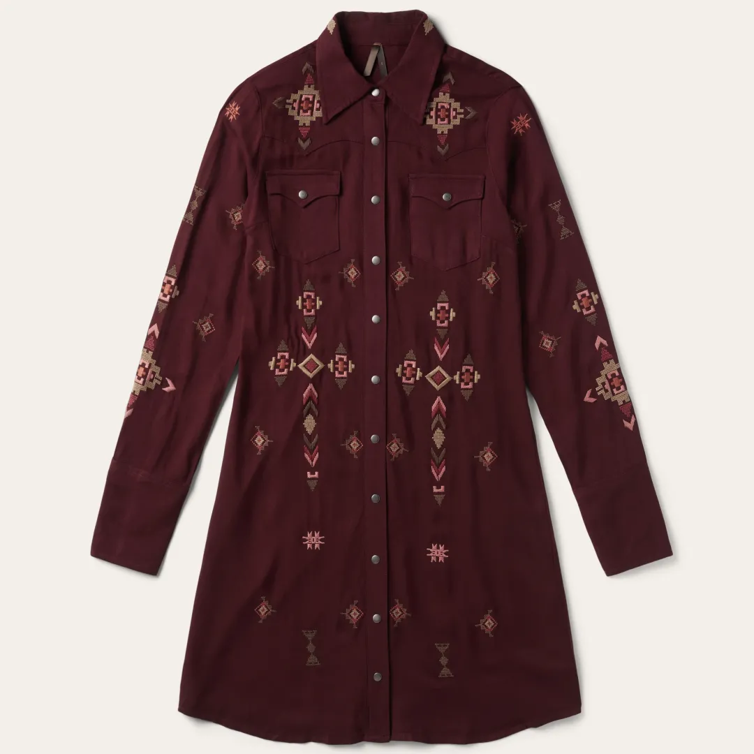 This shirt dress wears its Western influence well, with its stunning embroidered detail and other authentic style details. Crafted from 100% rayon twill that has a soft comfortable feel and a slinky drape, it has been yarn-dyed to retain its rich deep wine color. With a flattering fit that provides plenty of room to roam, it features single point front and back yokes, single point pockets with flaps and snap closures, five-snap cuffs and a classic snap front.