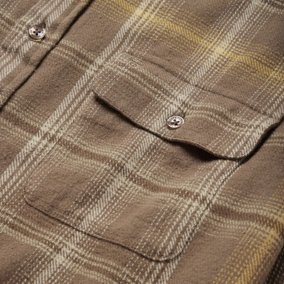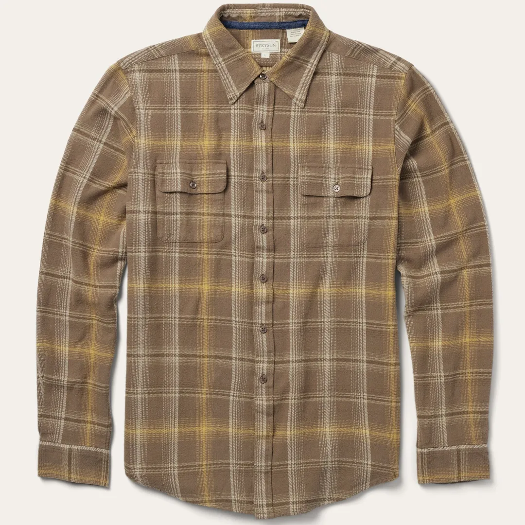 This button-front flannel shirt features an exclusive brown plaid pattern and is crafted from 100% cotton that has been yarn-dyed for rich, lasting color. It has no front yoke, a shallow straight back yoke with pleats, square pockets with flaps and button closures, two-button adjustable cuff, as well as contrast inside denim trim. Cut in our Modern Fit, for a trim, neat appearance that allows for comfort and freedom of movement. Exceedingly durable and always comfortable, our shirts are hard-wearing and built to last.