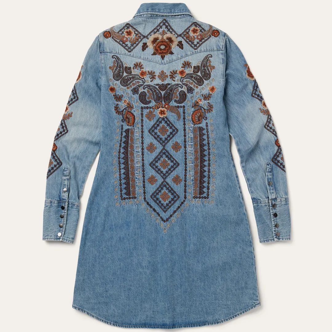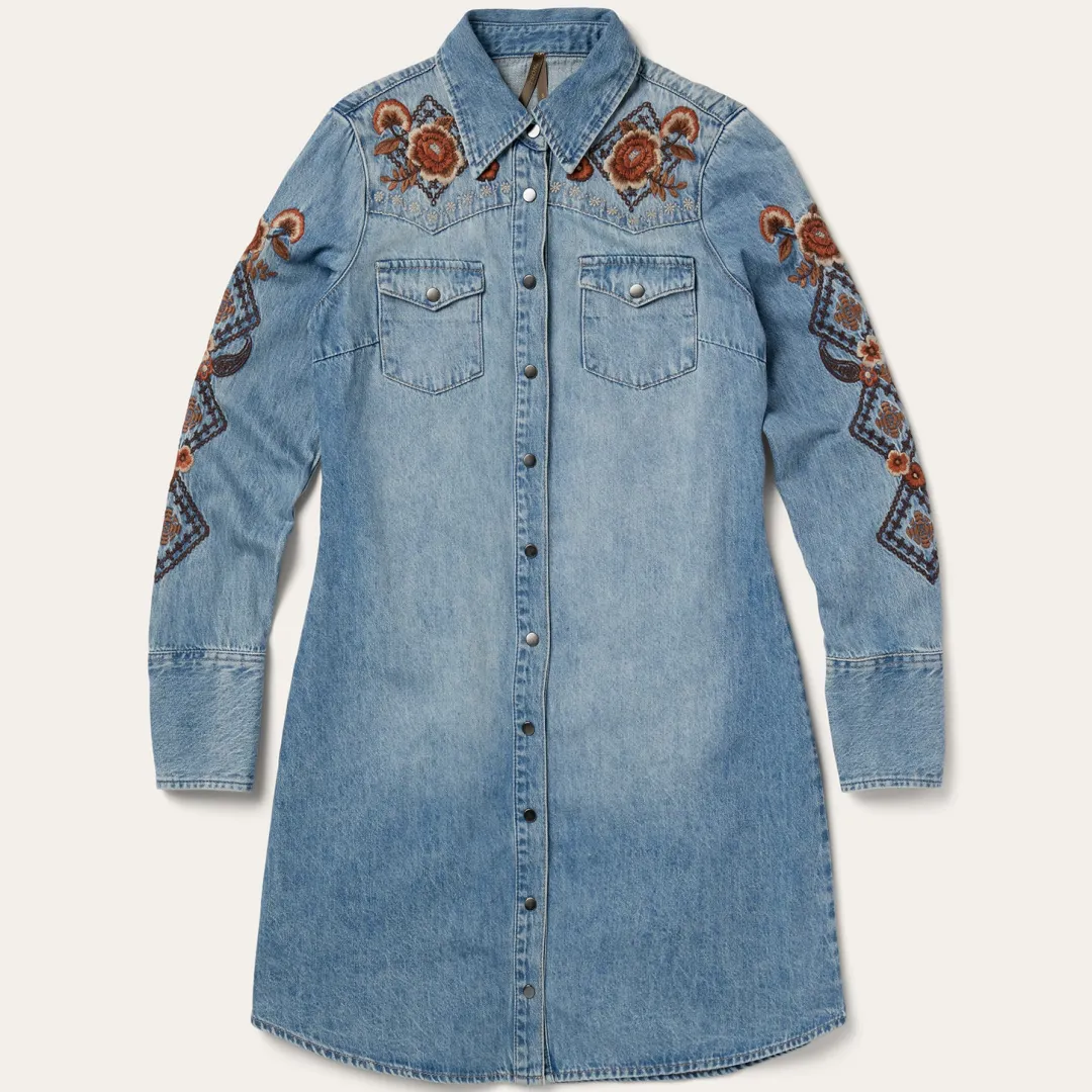 This denim shirt dress features stunning floral paisley embroidery at its front yoke, back and sleeves. Crafted from 100% cotton denim that has been garment washed for extra softness and a lived-in feel, it has western style to spare with a full snap front, single point front and back yokes and single point pockets with flaps and snaps. With a versatile design that can be worn on its own or over jeans, it’s the perfect complement to your favorite pair of boots.