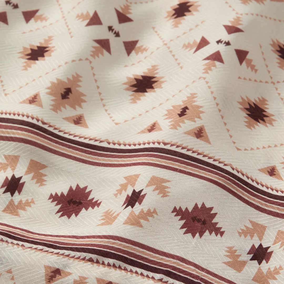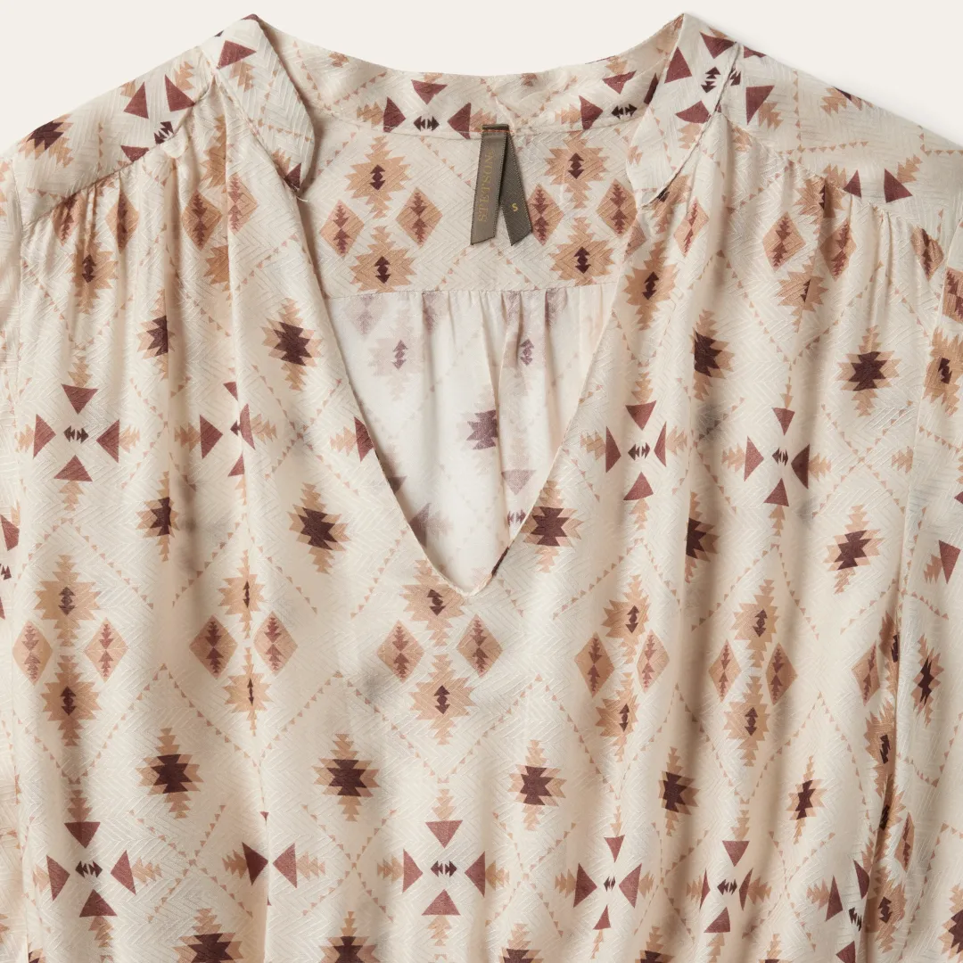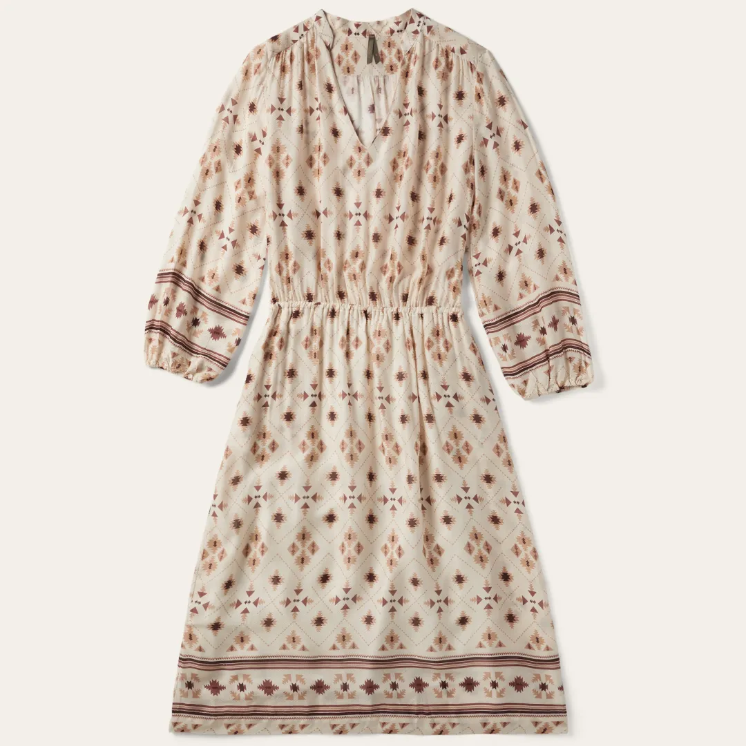 This mid-length zippered dress is woven from 100% rayon herringbone and features an allover, Western-inspired Gaucho Border print. It has 3/4 sleeves with elastic cuffs, a stand collar with a V-neckline, a straight back yoke with gathers below, an elastic waist and side seam pockets.