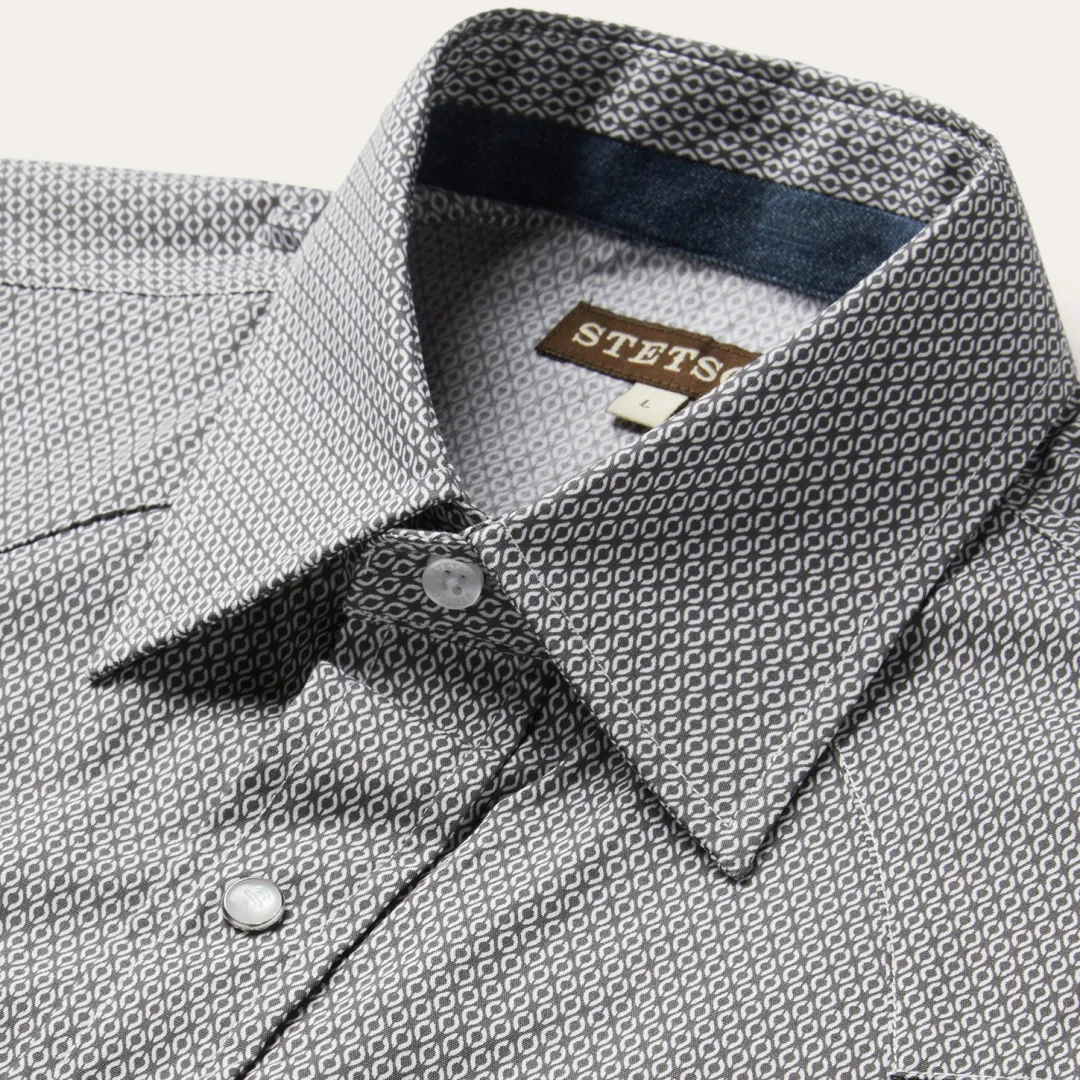 This Western shirt is crafted from a lightweight cotton poplin with a Grey Geo allover print. It features a one-point curved back yoke, logo pearl snap front, and three snap cuffs. The signature Stetson “S” logo is featured on the front left pocket and “STETSON” is embossed on the right sleeve placket. It has a denim strip on the inside collar band and is garment washed for a soft feel that only gets better with age. Cut trim for a modern fit and crafted with 100% cotton for quality and breathability.