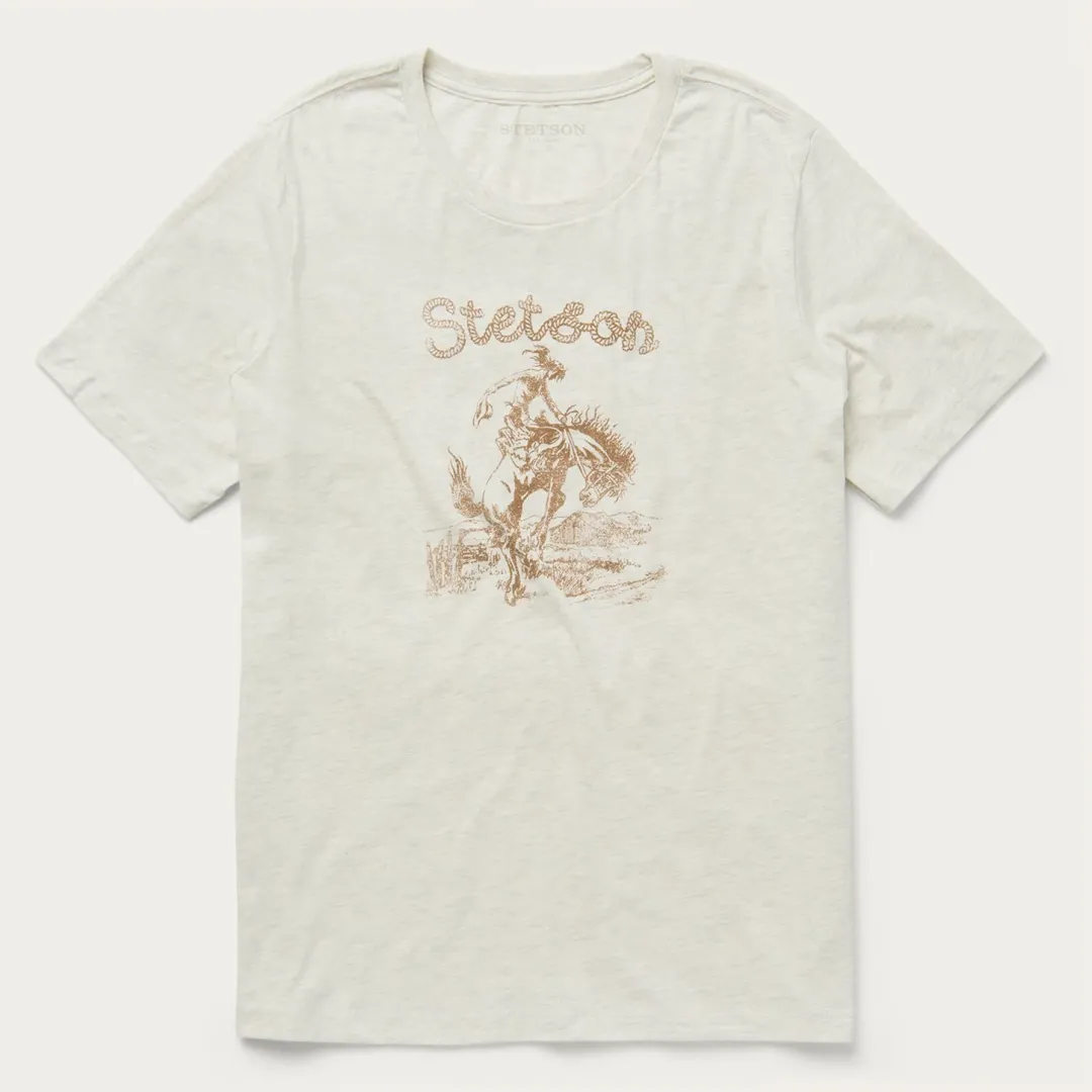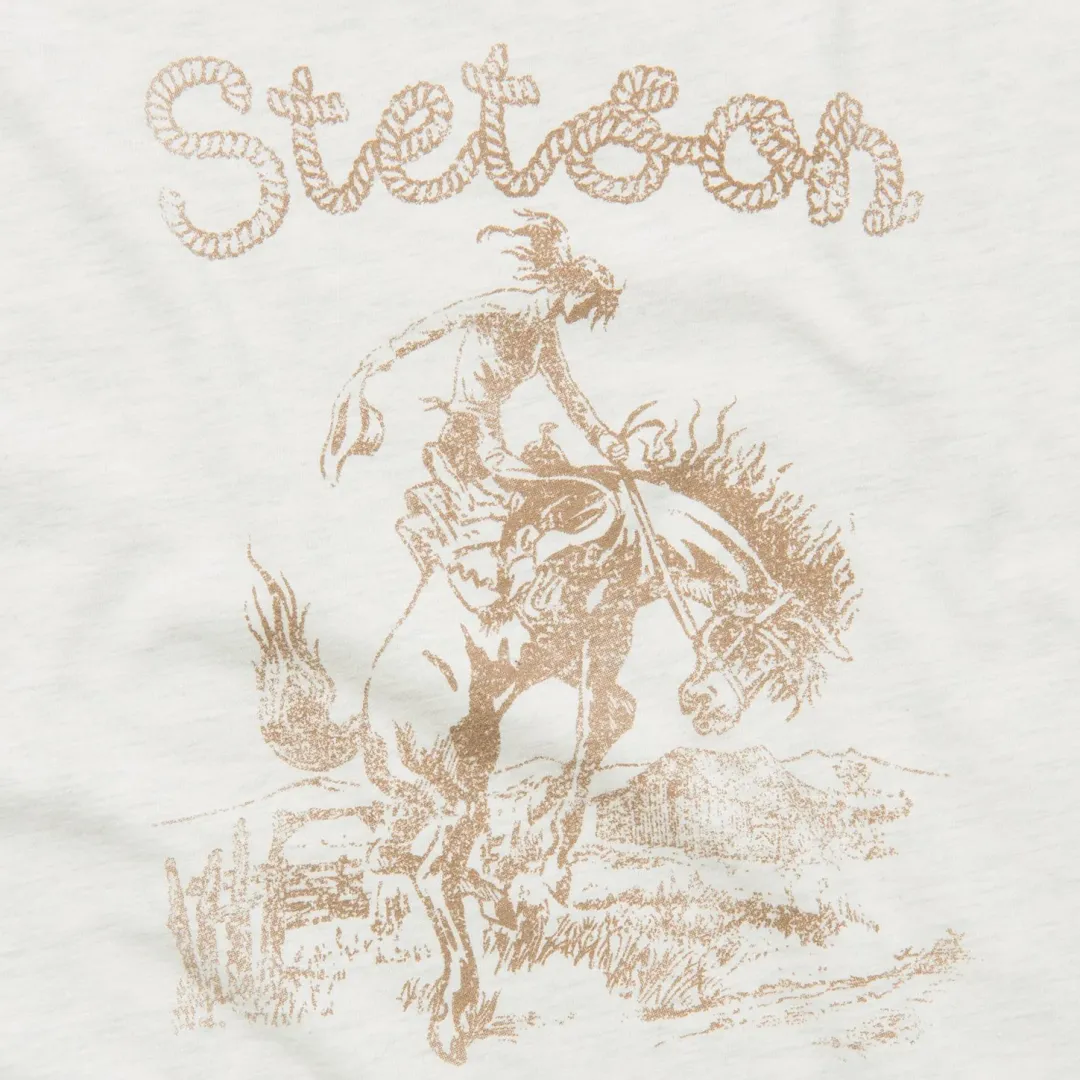 Nothing says good times like the relaxed feel of a graphic tee. Designed for maximum comfort without sacrificing an ounce of style, our t-shirts are made from airy cotton and screen-printed with custom signature graphics. This Western Stetson tee has been gently distressed, providing the perfect worn-in look for the spirited cowgirl. Go casual with a pair of jeans and boots, or dress things up with a skirt and sandals — however you decide to wear it, this shirt will see you through your day and then some. Extra soft and cut with the perfect slim fit, it’s an instant classic.