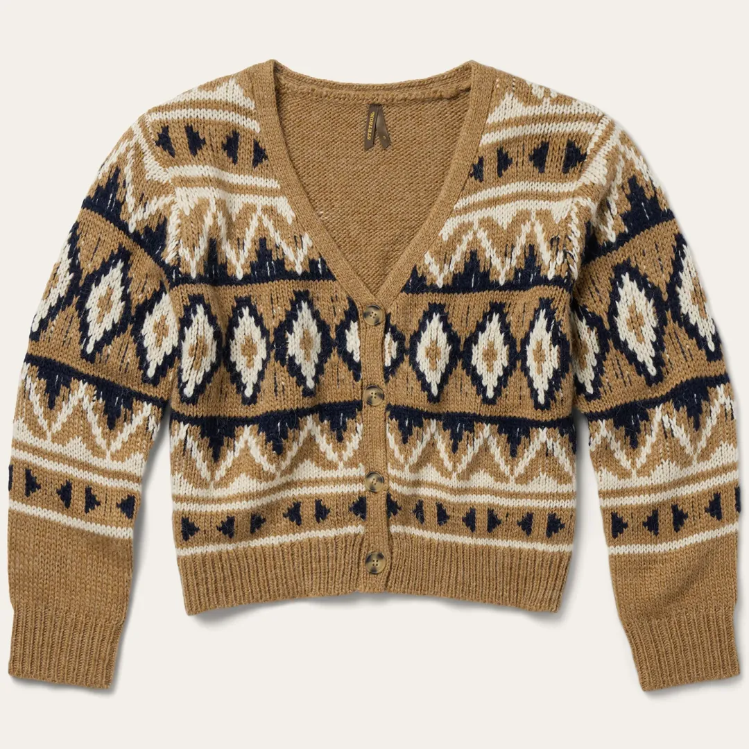 This stunning southwest-inspired cardigan sweater is made from a soft and comfortable acrylic/alpaca blend that has been yarn-dyed for rich, lasting color. It features a gold aztec print design, V-neck and four-button front placket, ribbed cuffs and a waist-length hem for a modern, flattering fit.
