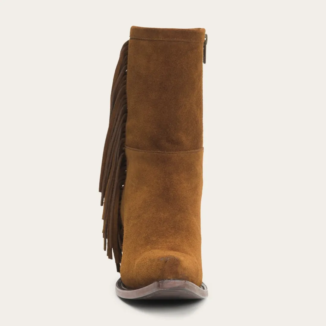 Hit the town with a mix of panache and cowgirl style. Handcrafted by Stetson’s legendary bootmakers from vintage-finished suede. Features include angle fringes, cushioned insoles, premium brass nails and hand-driven lemonwood pegs that enable the boot to withstand the elements by expanding and contracting with any moisture the boot may encounter. Each pair is stitched and tooled by hand to ensure absolute comfort and performance. Frontier-tough, they conform to the wearer over time for years of reliable service. A classic addition to any wardrobe, these boots are a fitting companion for anyone with a strong appreciation for objects that are made well and get better with age.