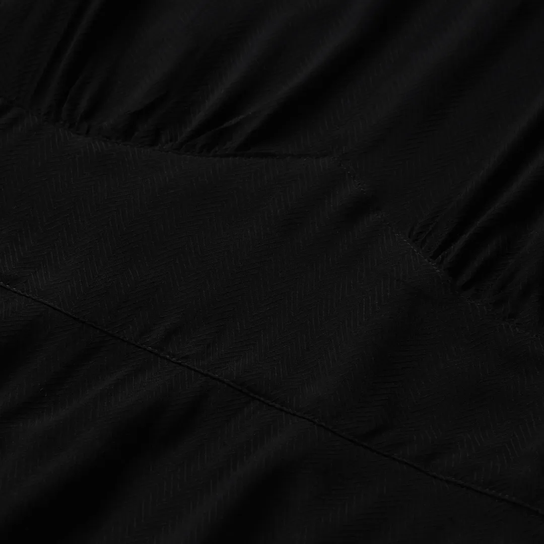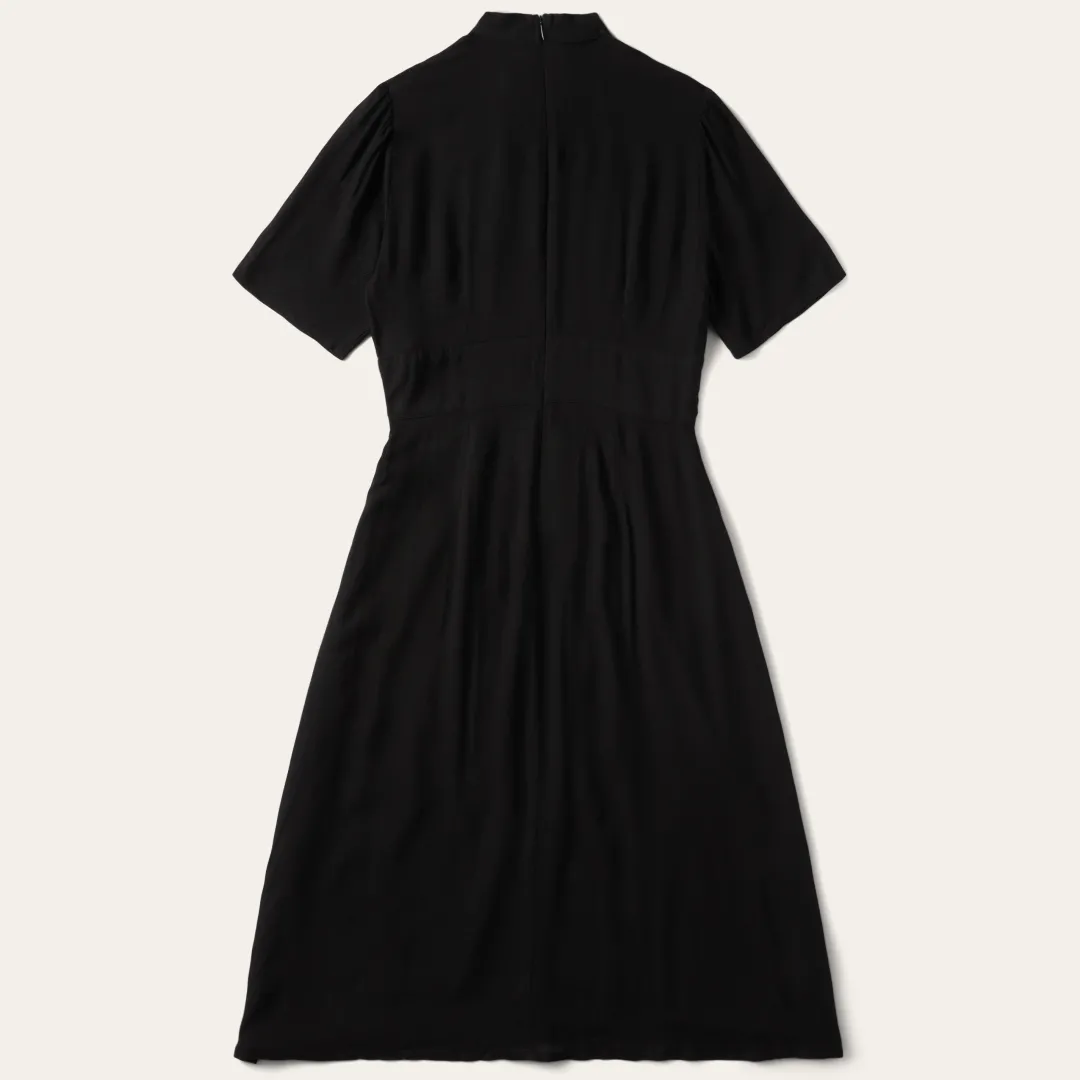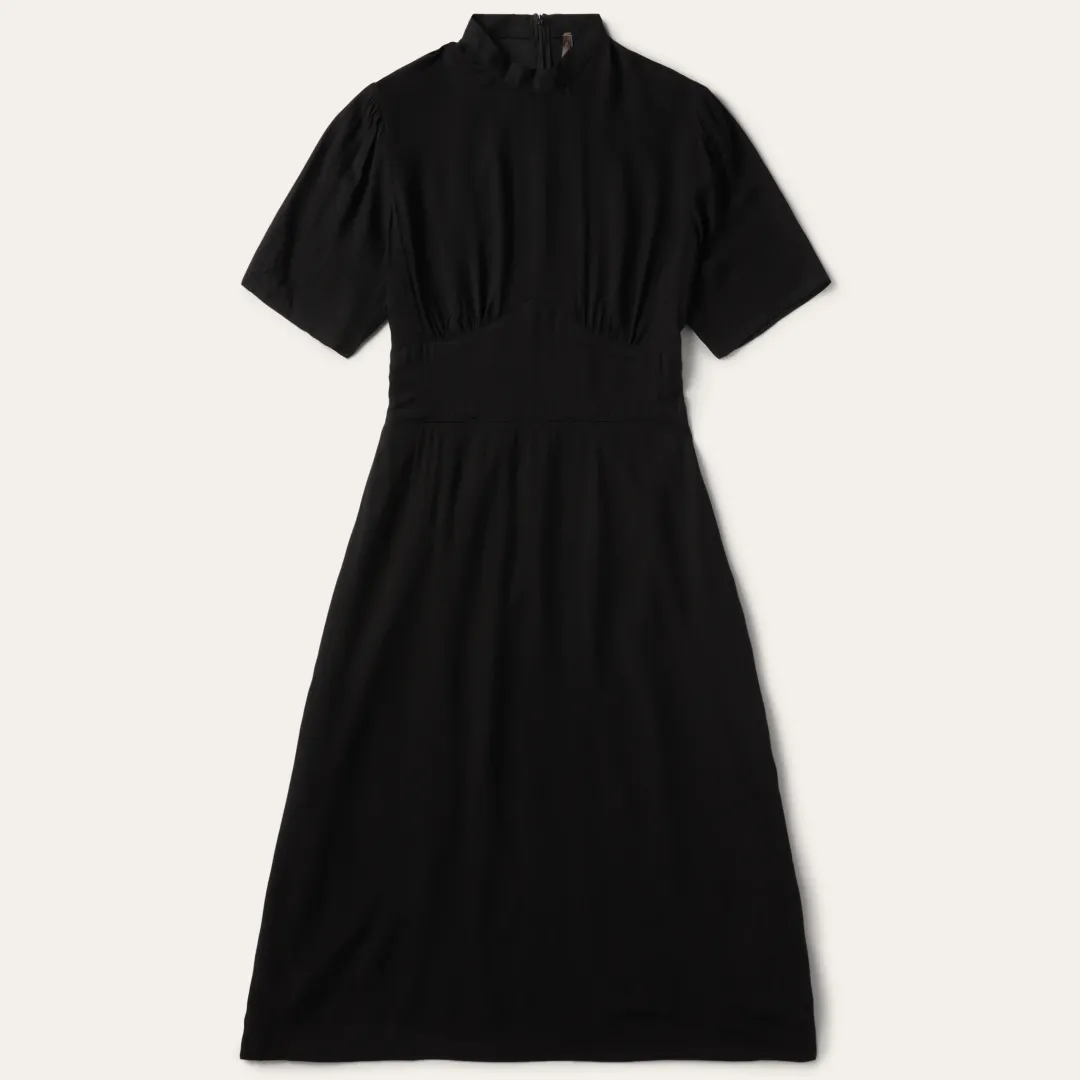This stylish black midi dress has short sleeves with a slight puff at the shoulder and a stand collar with hook & eye and an invisible zipper closure. It’s gathered at the bust and back darts above a fitted waistband, for a flattering fit. Woven from high-quality rayon herringbone twill that has been yarn-dyed for rich lasting color, it’s crafted for comfort and made for easy movement.